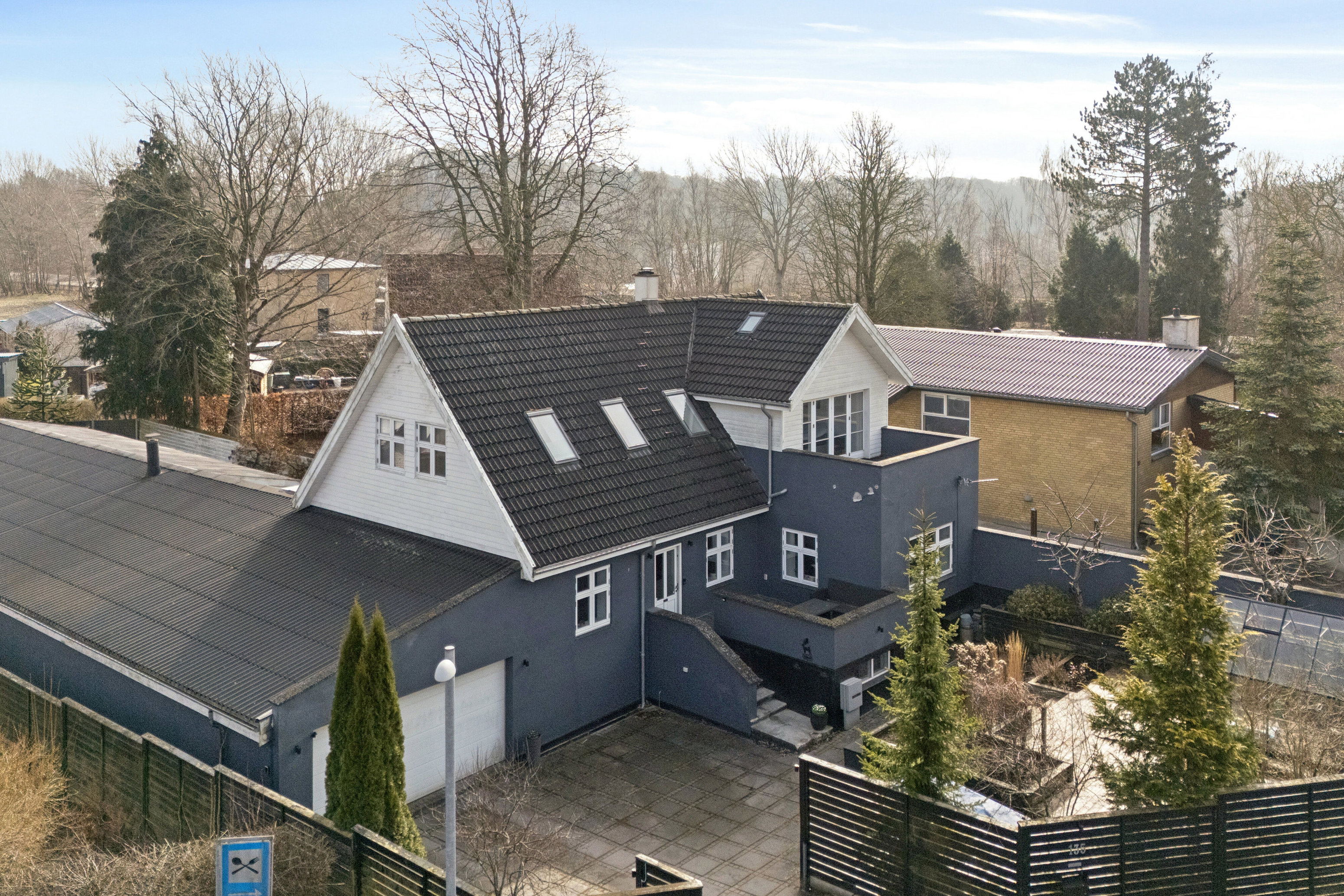 På vestsiden af huset er der en stor, flisebelagt terrasse, mens der på østsiden er en skøn og fint afskærmet have, som er nærmest vedligeholdelsesfri. Og hvis I vil have vild natur, så er Terkelskov lige rundt om hjørnet.
