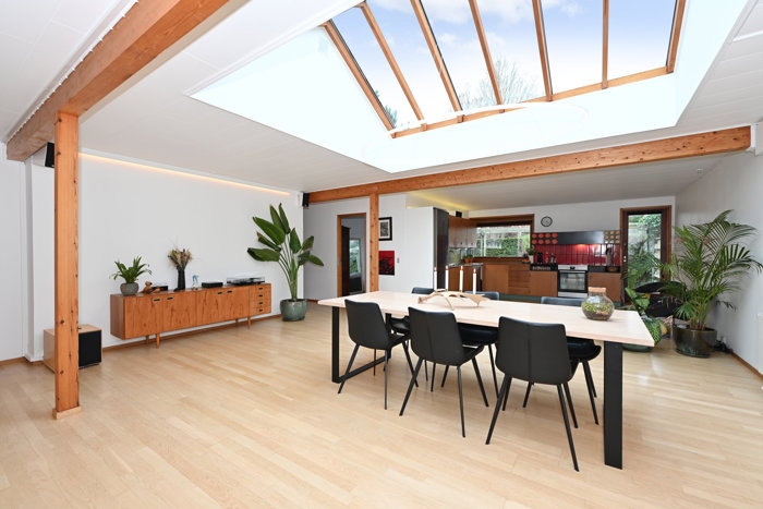 Boligens indbydende entré er rummelig og komfortabel med gulvvarme og leder videre til husets naturlige samlingspunkt: det imponerende køkken-alrum. Her er imponerende og unikt, med rækker af rytterlysvinduer, som lader solen danse gennem rummet og tilfører en let og luftig atmosfære. Rummet er markant større, end man normalt oplever, og skaber straks en fornemmelse af overskud og velvære. Køkkenet ligger åbent i forbindelse med spiseafdelingen og fremstår originalt og velholdt – komplet med den ikoniske emhætte og de indbyggede opbevaringsdåser i røde og orange nuancer.