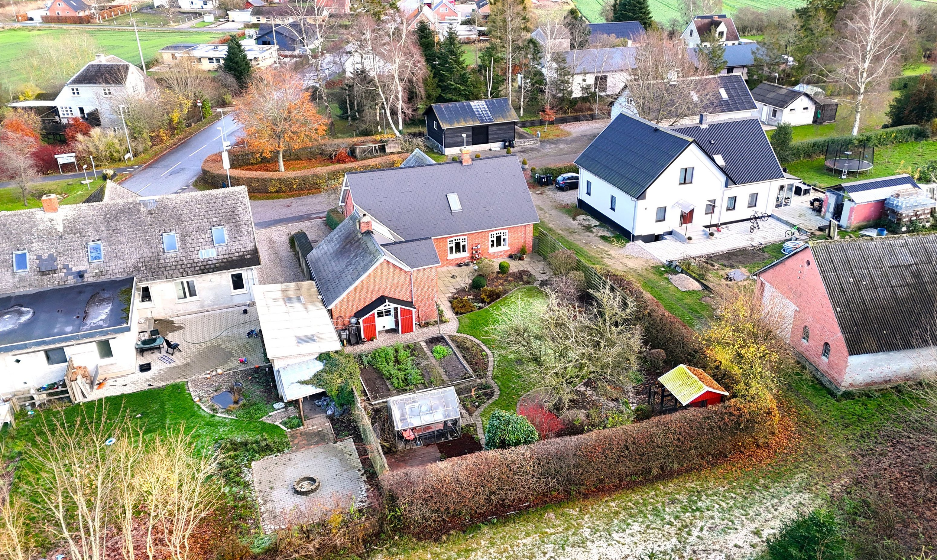 Her er flere små grønne ’rum’ med højbede, drivhus og en skøn flisebelagt terrasse, hvor du kan nyde dagens stille øjeblikke. Alt er gennemtænkt, velholdt og skabt til et liv i balance.