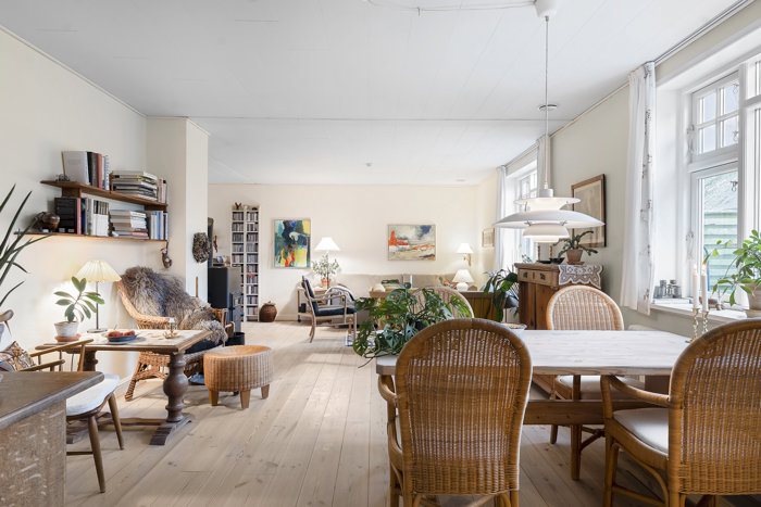 Villaens 205 m² fordeler sig harmonisk på to plan, og allerede i det indbydende køkken-alrum mærker man den varme atmosfære. Herfra er der åben forbindelse til den hyggelige vinkelstue, hvor de massive fyrretræsplanker giver en naturlig og rolig stemning. Planløsningen gør det let at være sammen — selv på travle dage.