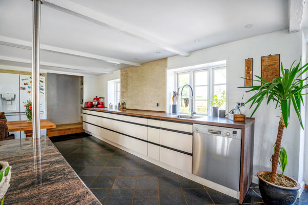 Du bydes velkommen i en lys entré, som giver adgang videre til boligens centrale opholdsrum. Her finder du det store køkken-alrum, som udgør hjemmets naturlige samlingspunkt. Køkkenet er indrettet med gode materialer, et stilrent udtryk og en praktisk køkkenø, mens der er god plads til spiseafdeling. Alrummet er lyst og indbydende, og her er direkte forbindelse til den rummelige udestue, som forlænger boligens opholdsarealer og skaber en flot overgang mellem inde og ude samt nem adgang til vaskerum og teenageværelset.