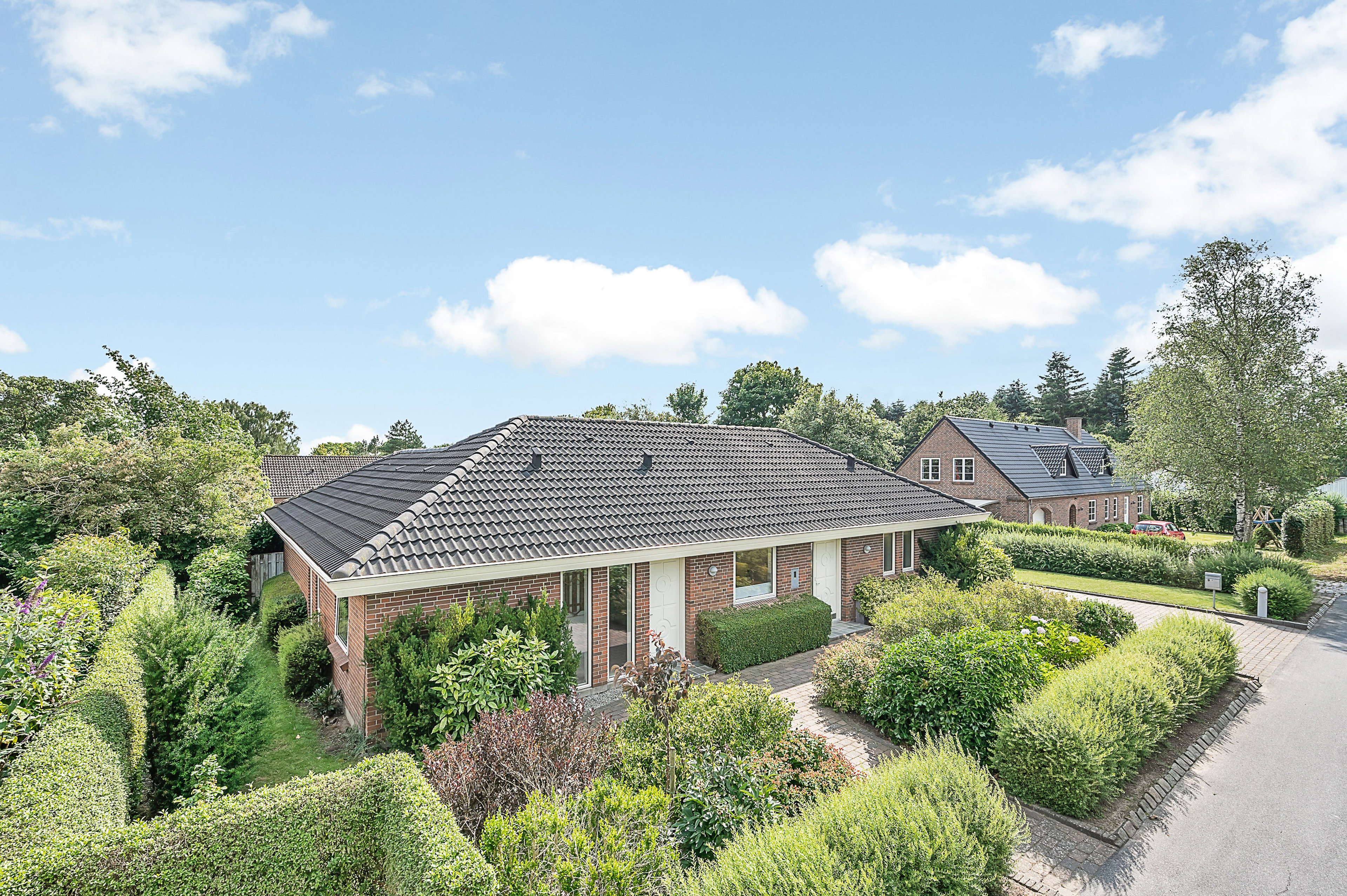 Huset ligger perfekt med en sydvendt, vind-beskyttet terrasse og en niveau-forskudt, helt ugeneret have. Nederst i haven findes en overdækket terrasse samt et praktisk rum til haveredskaber. Den murede carport indbefatter et lille værksted med arbejdsbord og skabe. Med en omlægning af forhaven nord for huset blev i 2012 skabt mulighed for gæsteparkering på grunden samt en bred flisegang frem til husets indgangsdøre.