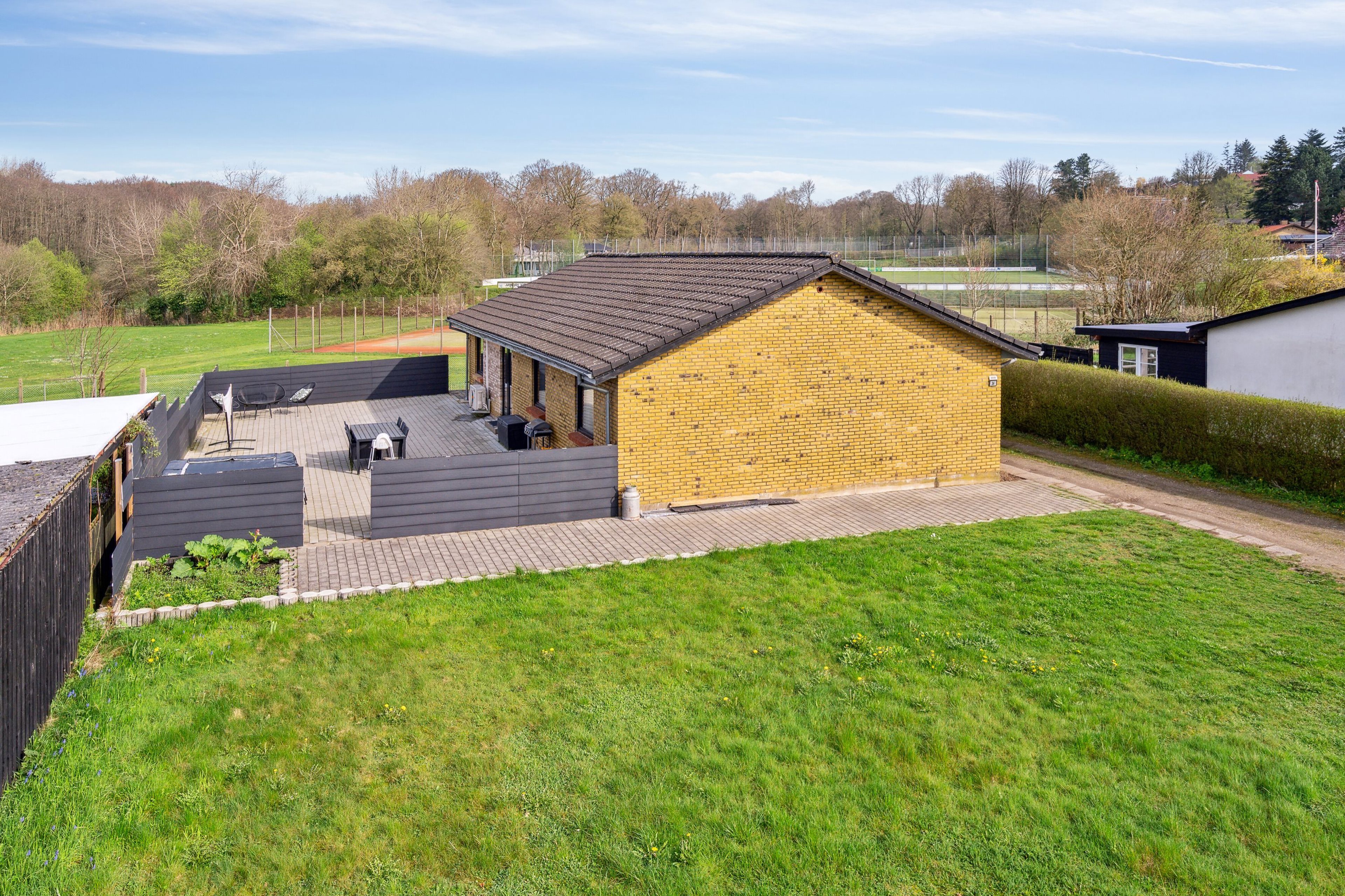 Grunden er overkommelig at passe, da den udover den store, nyanlagte terrasse hovedsageligt er udlagt som græsplæne. Dette giver god tid til at sidde på terrassen og nyde det flotte udsyn til skoven og de grønne områder der grænser op til grunden.