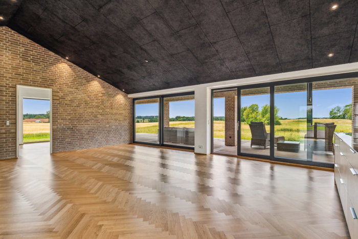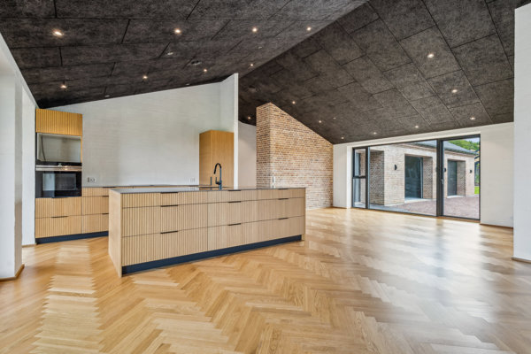 Boligen strækker sig over 216 m2 og fremstår med en lys og indbydende atmosfære. Det store opholdsrum er husets naturlige samlingspunkt med imponerende gulv-til-loft skydedøre, der åbner hjemmet op mod den omkringliggende natur og giver en ubeskrivelig udsigt til den næsten 2,5 hektar store grund – et sandt paradis med dyreliv, hvor rådyr dagligt finder vej forbi. Køkkenet er udført i eksklusive elementer fra KVIK og ligger i åben forbindelse med stuen, hvilket skaber en fantastisk ramme om både hverdagsliv og gæstebesøg.