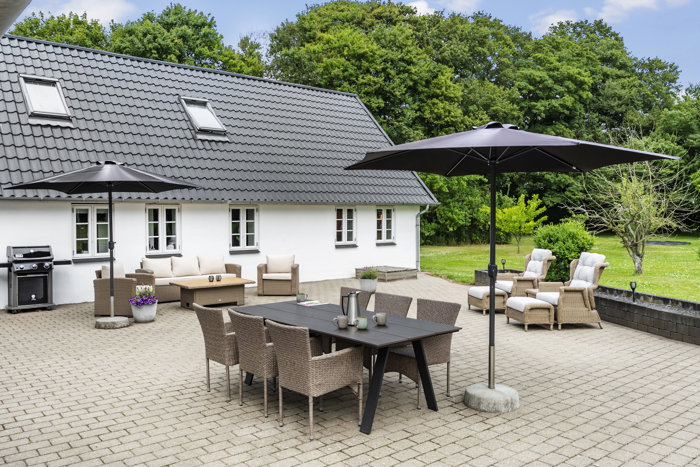 Køkkenalrummet er et af hjemmets naturlige samlingspunkter. De store vinduespartier og loft til kip giver et fantastisk lysindfald og en følelse af rummelighed. Herfra er der direkte udgang til den solrige terrasse, hvor udelivet kan nydes i fulde drag. Den store stue imponerer med synlige bjælker og masser af atmosfære – et perfekt sted til afslapning eller hyggelige sammenkomster.