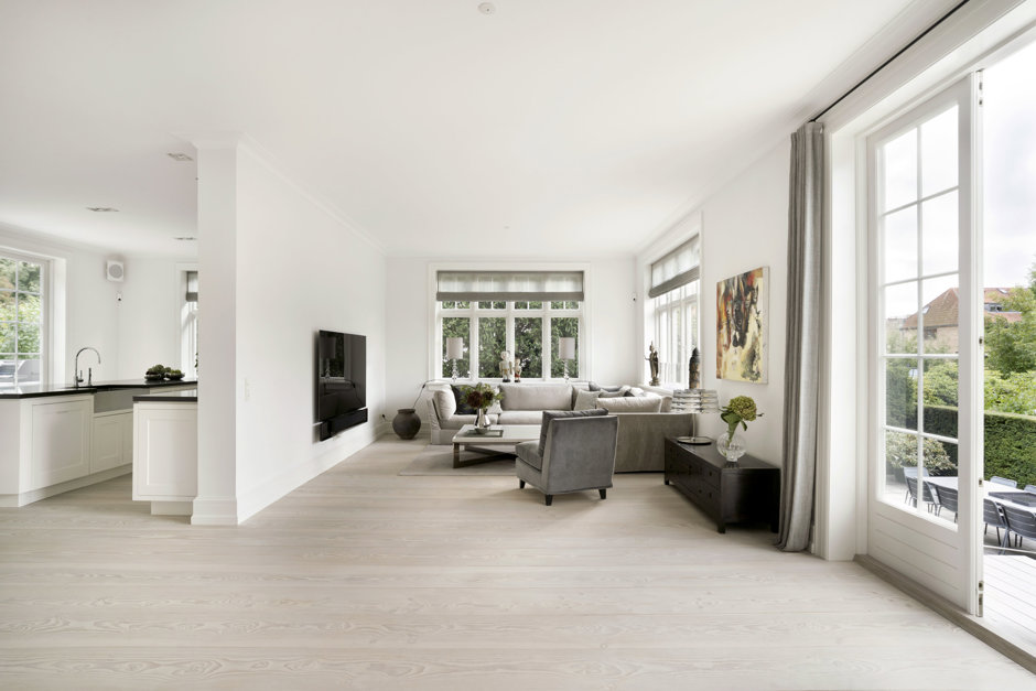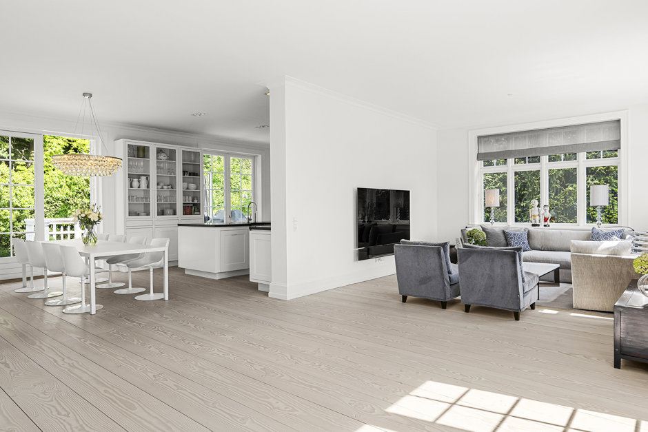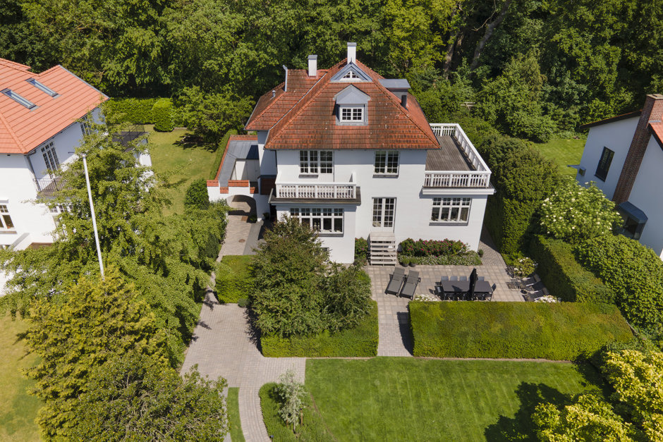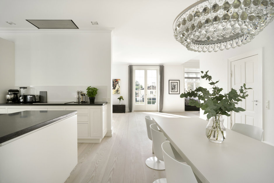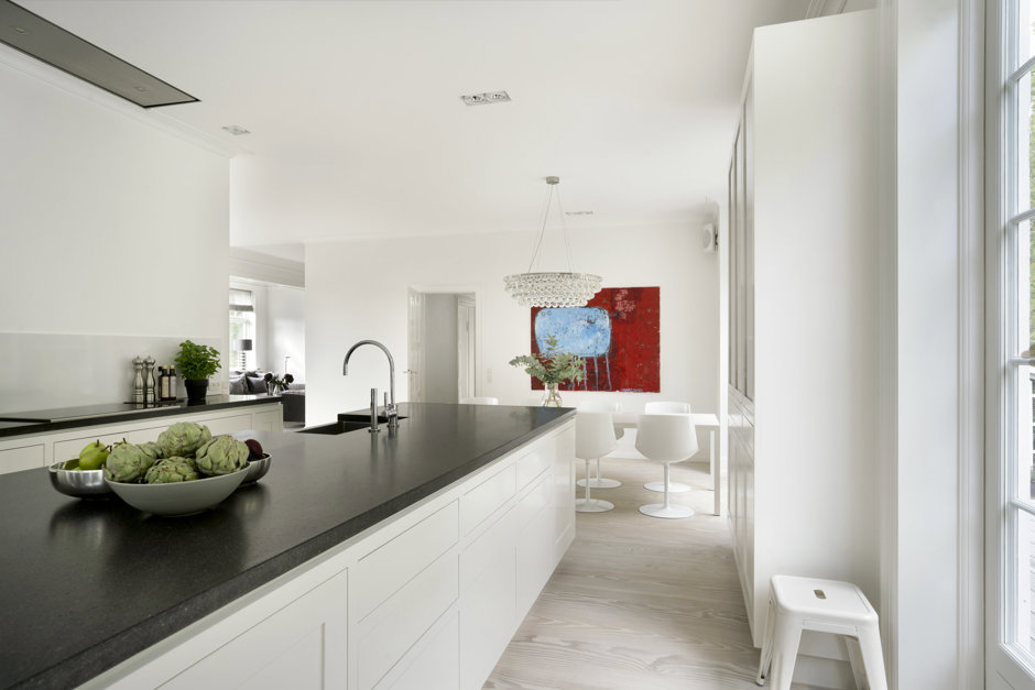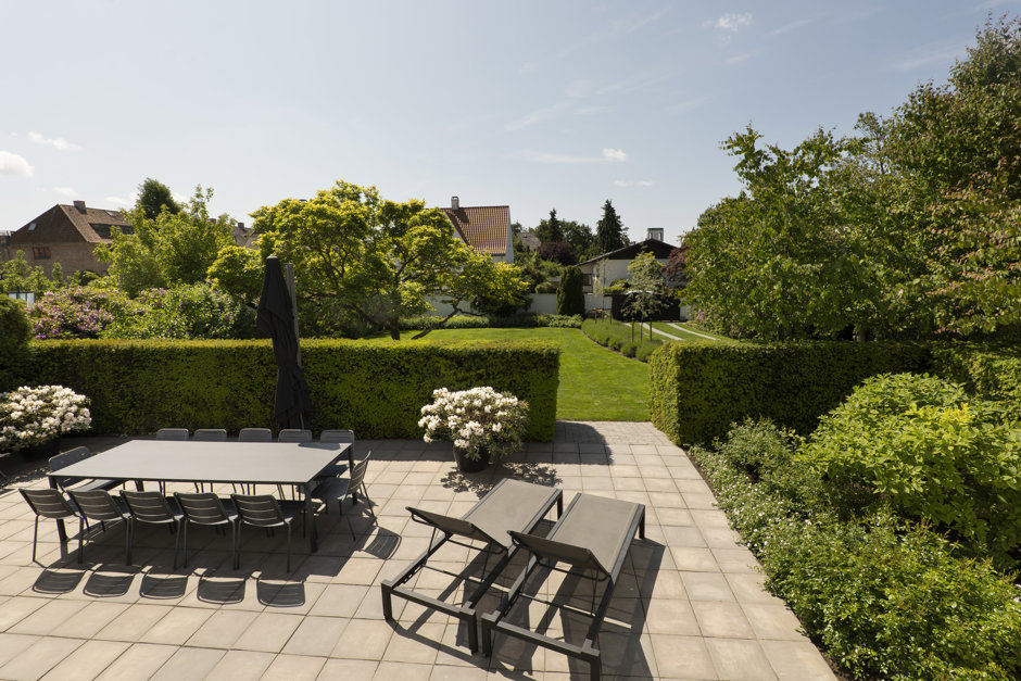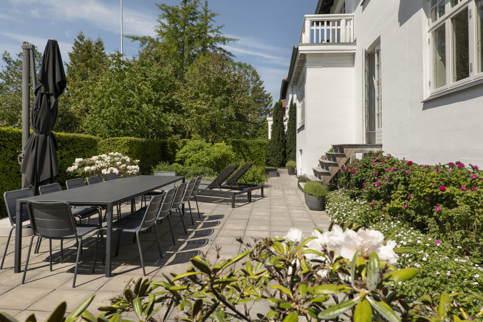 Materialerne er nøje udvalgt: arkitekttegnet snedkerkøkken, skræddersyede garderober og bibliotek, brede Dinesen plankegulve, vinduer fra Linolie Døre & Vinduer, belysning fra Møller & Rothe, Dornbracht armaturer, Flaminia sanitet, Boffi badekar og Patricia Urquiola klinker. Haven og terrasserne er designet af landskabsarkitekt Anne Stausholm og belagt med håndstrøgne tegl fra Petersen Tegl.