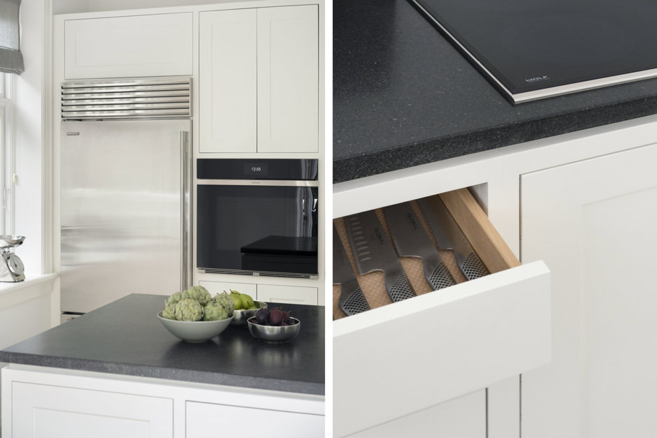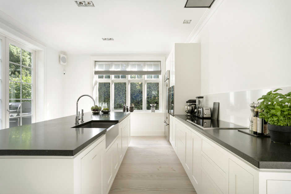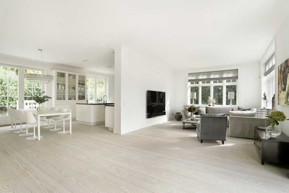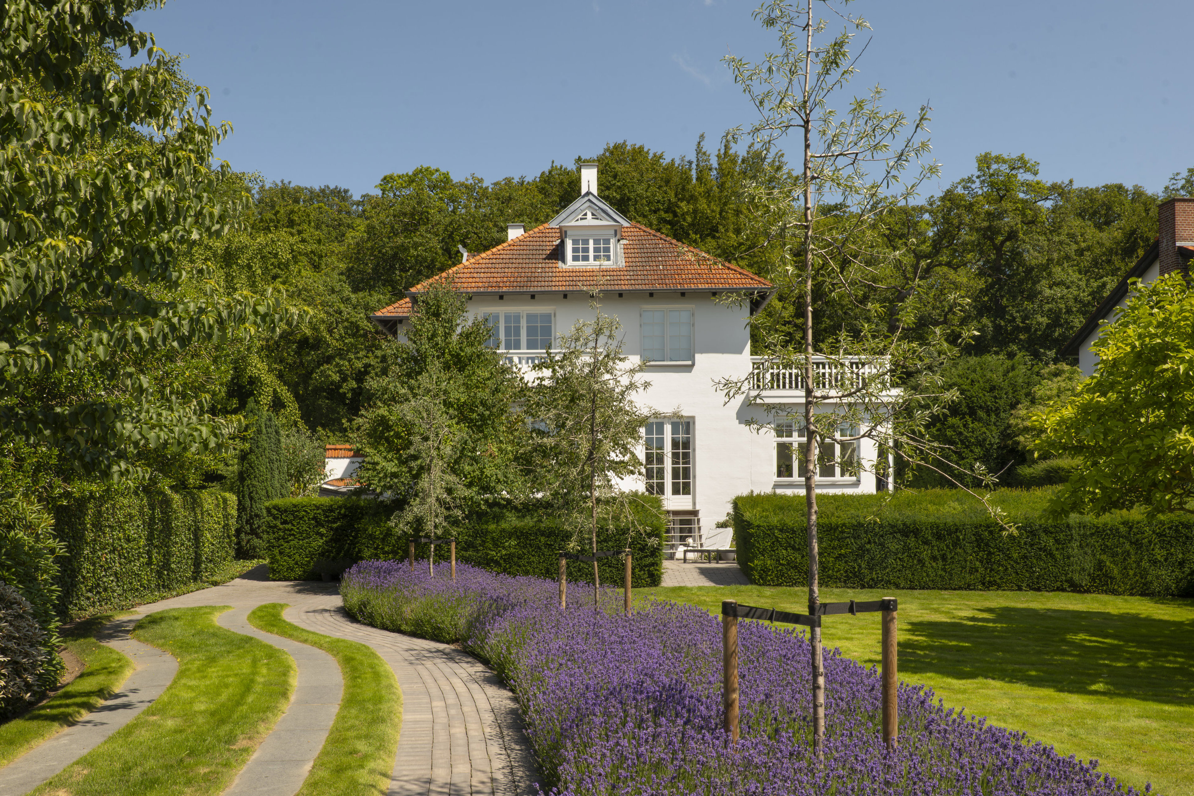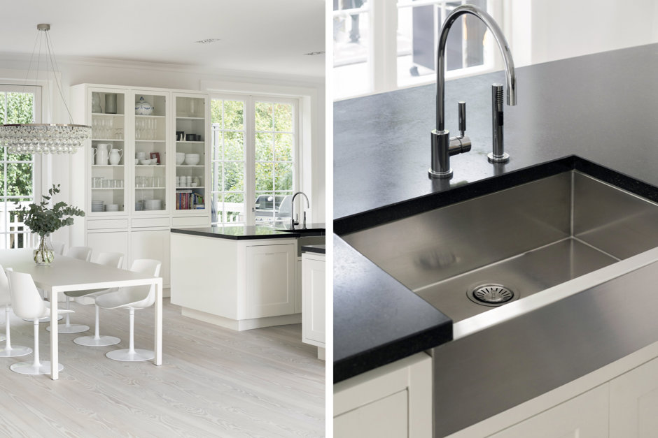 Materialerne er nøje udvalgt: arkitekttegnet snedkerkøkken, skræddersyede garderober og bibliotek, brede Dinesen plankegulve, vinduer fra Linolie Døre & Vinduer, belysning fra Møller & Rothe, Dornbracht armaturer, Flaminia sanitet, Boffi badekar og Patricia Urquiola klinker. Haven og terrasserne er designet af landskabsarkitekt Anne Stausholm og belagt med håndstrøgne tegl fra Petersen Tegl.