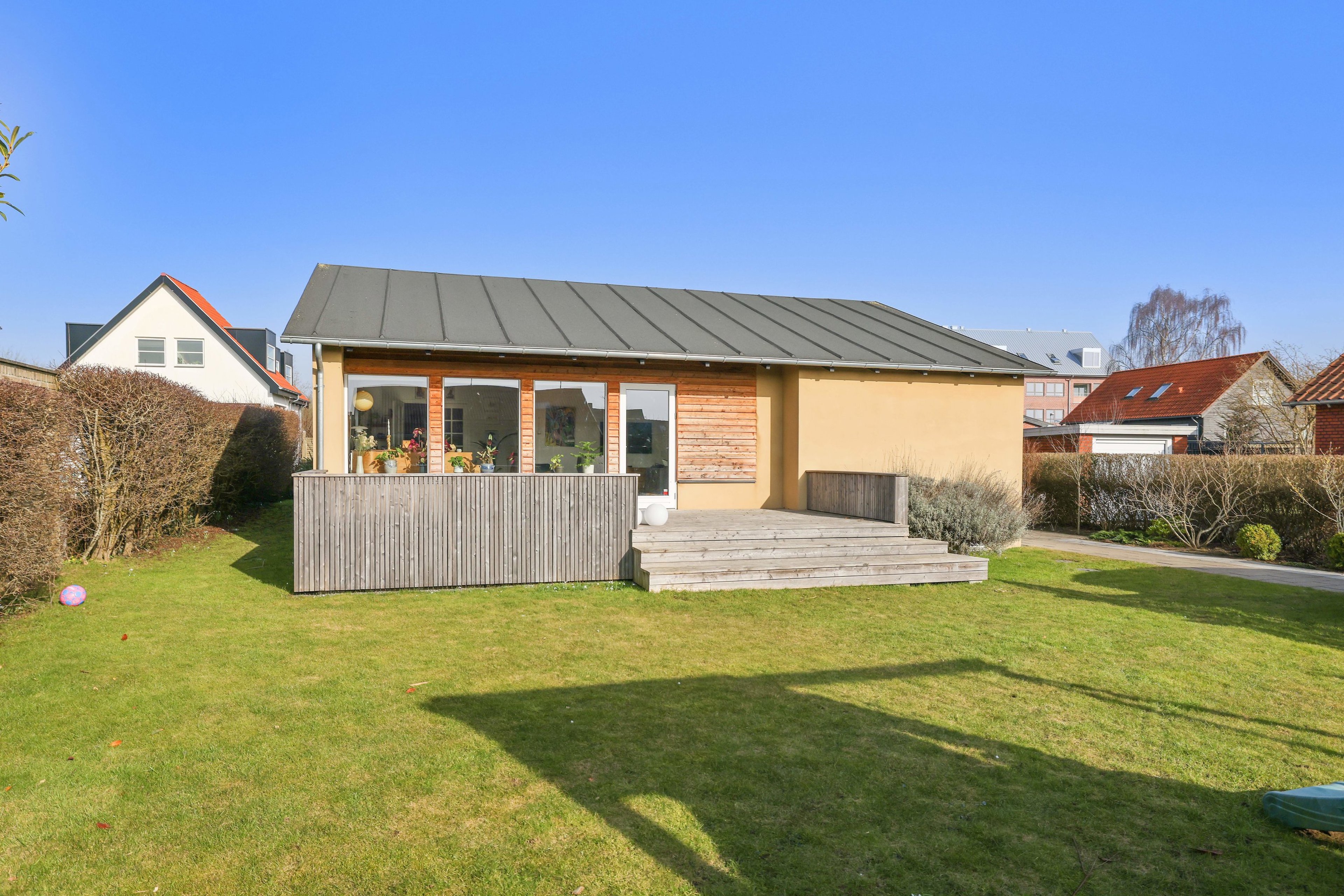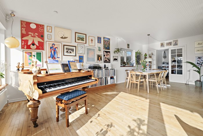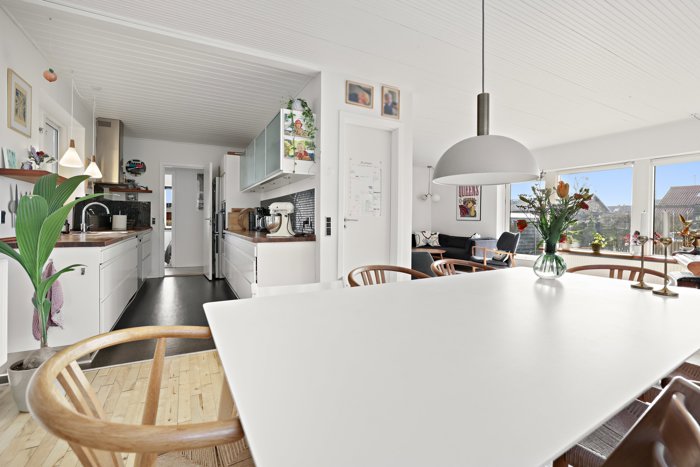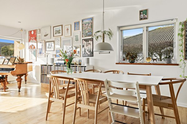Boligen fremstår lys og indbydende med et skønt lysindfald fra de store vinduespartier, som skaber en behagelig atmosfære i opholdsrummene og understøtter hjemmets åbne og imødekommende stemning.