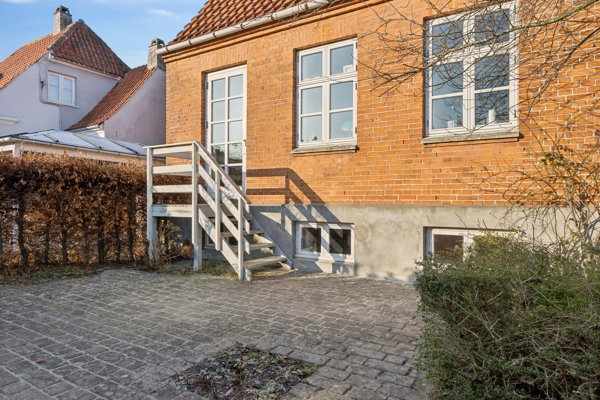 Huset indeholder: Det meste af stueetagen er afsat til smukke, højloftede stuer med stuk, plankegulve og gennemgående lysindfald. Den ene stue forener sig med køkkenalrummet, således at der er en åben fornemmelse i indretningen, og samtidig kan I trække jer tilbage til stuen bag de franske døre. Køkkenet præsenterer sig stilrent med funktionelle løsninger og bemærk brændeovnen, som beriger stemningen i aftentimerne. I både stueplan og på 1. sal er der badeværelser, hvoraf det ene er placeret i tilbygningen som en del af en værelsesafdeling. Yderligere to værelser (potentielt tre) ligger side om side på 1. salen, mens kælderen supplerer med gode disponible rum, et vaskerum og garage, der nemt kan inddrages til resten af kælderen.