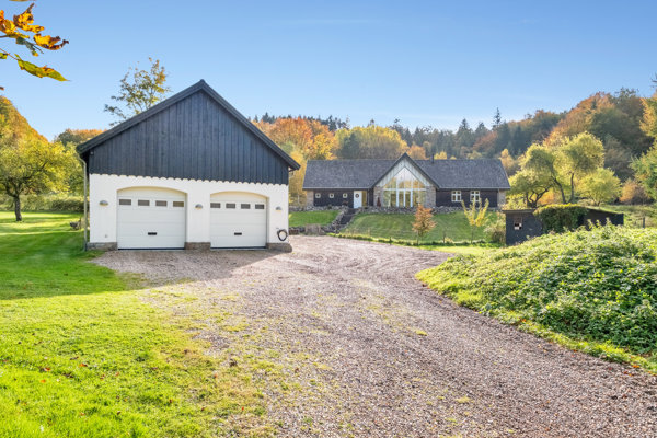 Allerede ude fra vejen, hvor man ser den store garagebygning med to porte og stuehuset med det enorme gavlkvistvindue, ved man instinktivt, at denne ejendom er noget særligt. Og skuffet, det bliver man nu heller ikke, for det er 204 m2 ekstraordinært liebhaveri fra 2012, der venter her på en ganske uovertruffen placering.