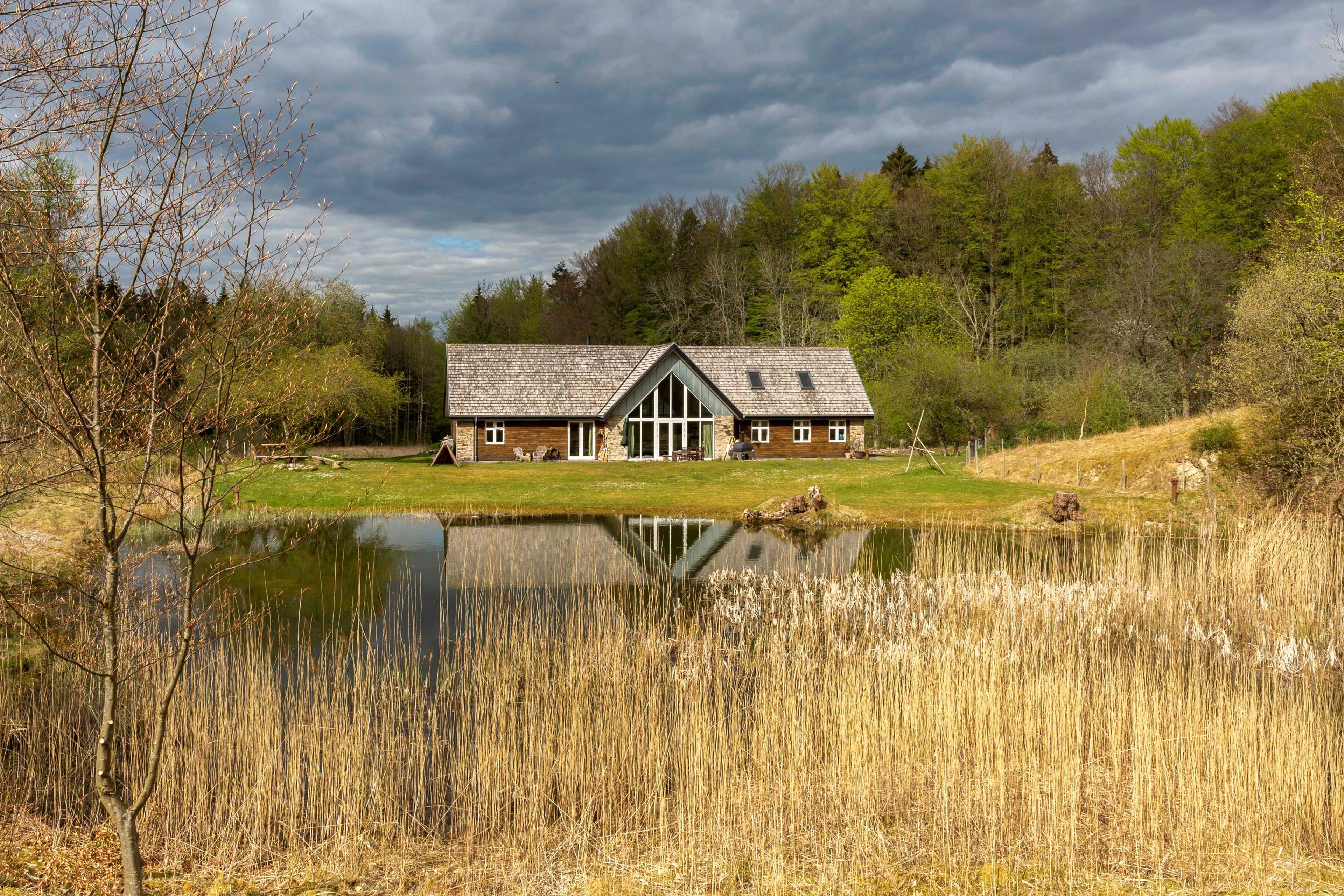 Det er ganske enkelt et mageløst opholdsrum med et kæmpe køkken-alrum, som adskilles i to rum af en rustik skillevæg på midten og endda med en mindre pejsestue med brændeovn til den ene side. I begge sider af rummet giver store gavlvinduer frit udsyn til skoven. Som om det ikke var nok, er der også åben etageadskillelse til førstesalen, hvor der er indrettet en stor opholdsstue med brændeovn. Alt i alt tre separate rum, der på en og samme tid er ét stort opholdsrum.