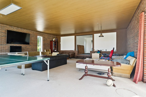 • En lys og indbydende stue med direkte udgang til haven – her er det let at forestille sig hyggelige stunder med gæster, afslapning og hverdagsliv.