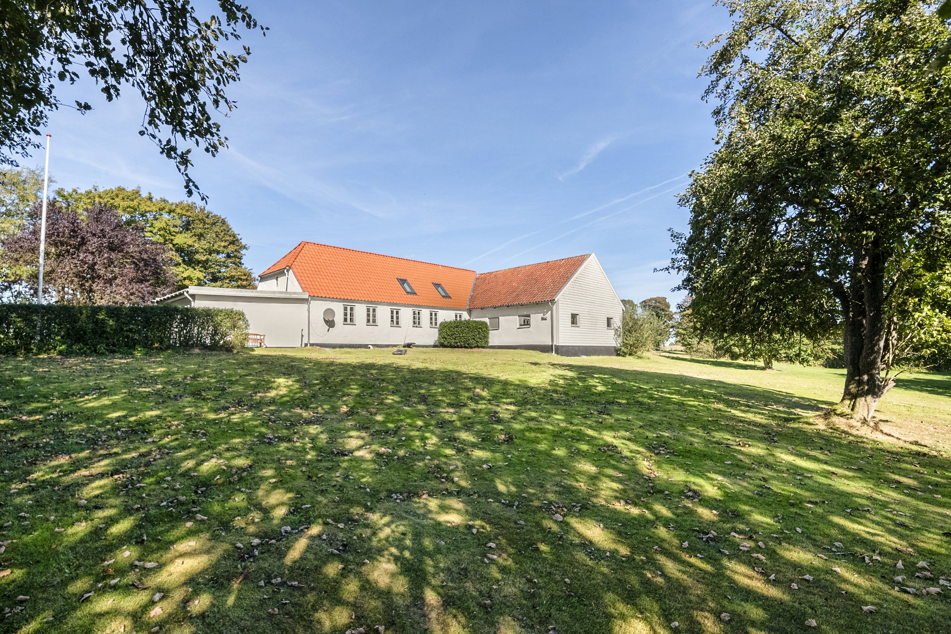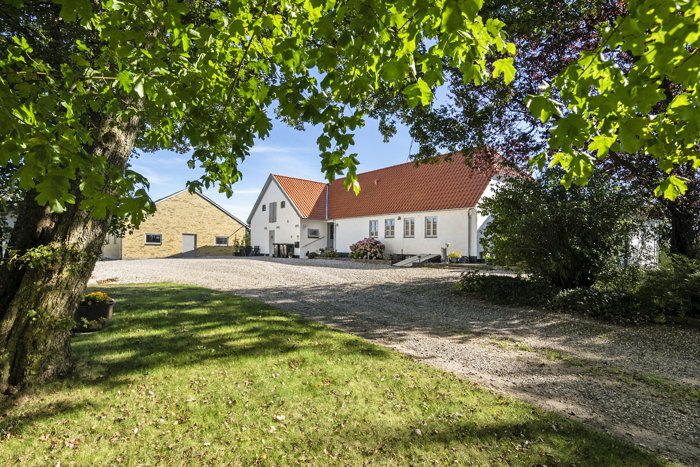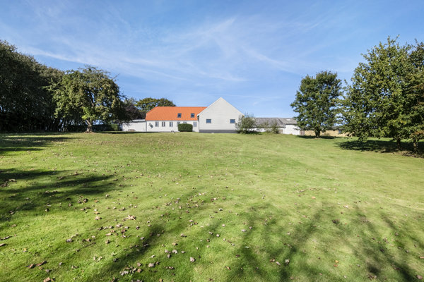 Allerede ved ankomsten mødes I af de bølgende marker og den vidstrakte udsigt over det smukke landskab. Stuehuset ligger for enden af den charmerende gårdsplads og fremstår med hvidpudset facade samt et flot, nyere tegltag fra sidste år.