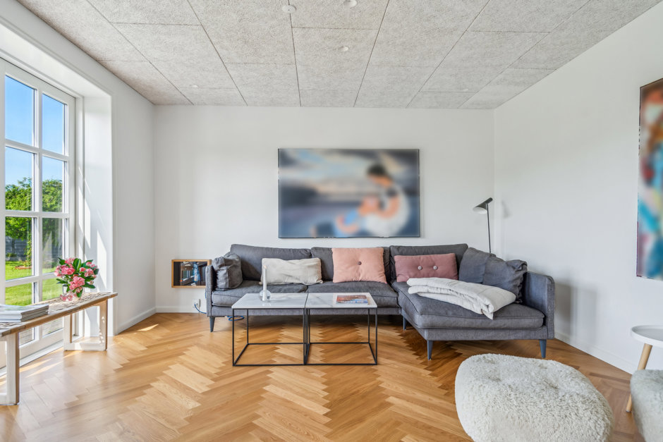 Den store, smagfuldt moderniserede bolig byder på en lys og indbydende atmosfære, hvor der er kræset for detaljerne. Indretningen rummer blandt andet et elegant og funktionelt køkken i åben forbindelse med de hyggelige opholdsstuer, hvor dagslyset strømmer ind fra flere verdenshjørner. Herfra er der direkte udgang til en solrig terrasse med udendørs spa og skøn udsigt over de grønne arealer. I stueplan findes desuden flere gode værelser, badeværelser, sauna samt et praktisk bryggers, mens førstesalen byder på forældreafdeling med walk-in closet og eget badeværelse.
