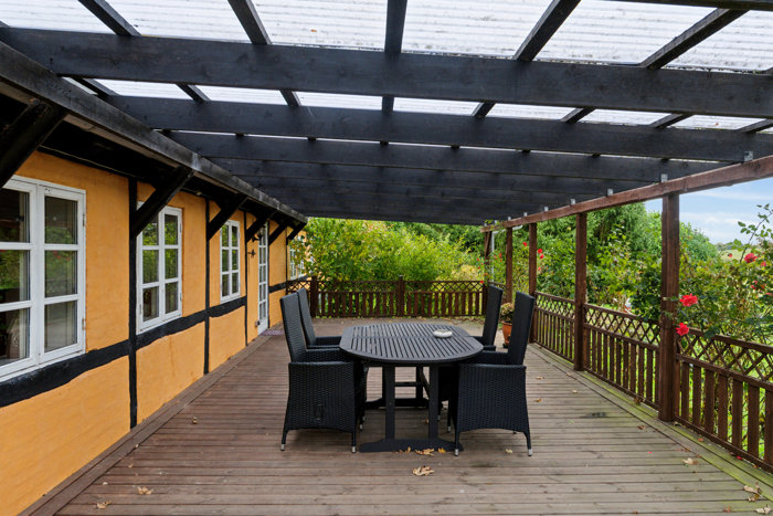 Fra den ene opholdsstue er der udgang til en meget stor træterrasse, som vender mod syd. Terrassen er også overdækket.