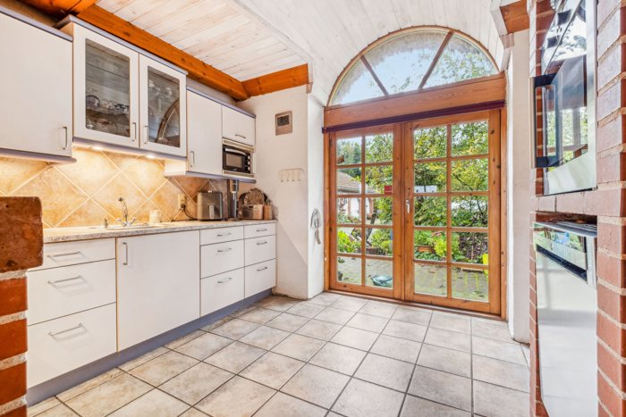 Indenfor bydes du velkommen i entréen, som leder videre til boligens hjerte: et lyst og åbent køkken-alrum. Her er god plads til både hverdag og gæster, og de store vinduer samt den direkte udgang til terrassen skaber en naturlig sammenhæng mellem inde og ude. Terrassen bliver hurtigt et yndet opholdssted, hvor udsigten til haven og det omkringliggende landskab kan nydes i fulde drag.