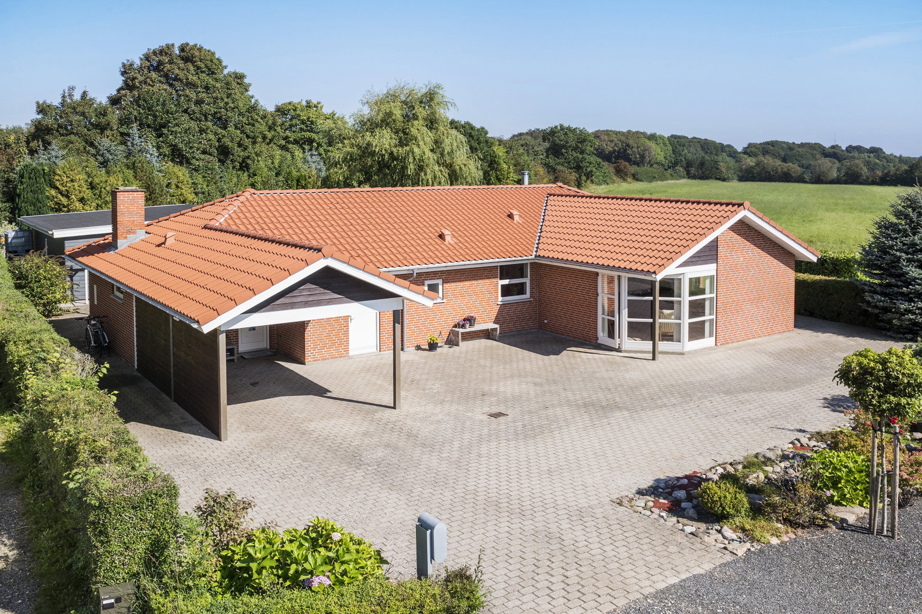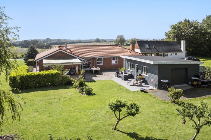 Udendørs er der også masser at glæde sig over. Haven er anlagt, så den er nem at holde, og de mange terrasser og overdækkede områder giver mulighed for at nyde solen fra morgen til aften. Her kan du drikke din morgenkaffe i de første solstråler, nyde en frokost i skyggen eller afslutte dagen med aftensmad under åben himmel. Derudover er der et stort værksted/hobbyrum, der giver masser af muligheder, hvad enten man har brug for plads til et kreativt projekt, en lille hjemmevirksomhed eller ekstra opbevaring.