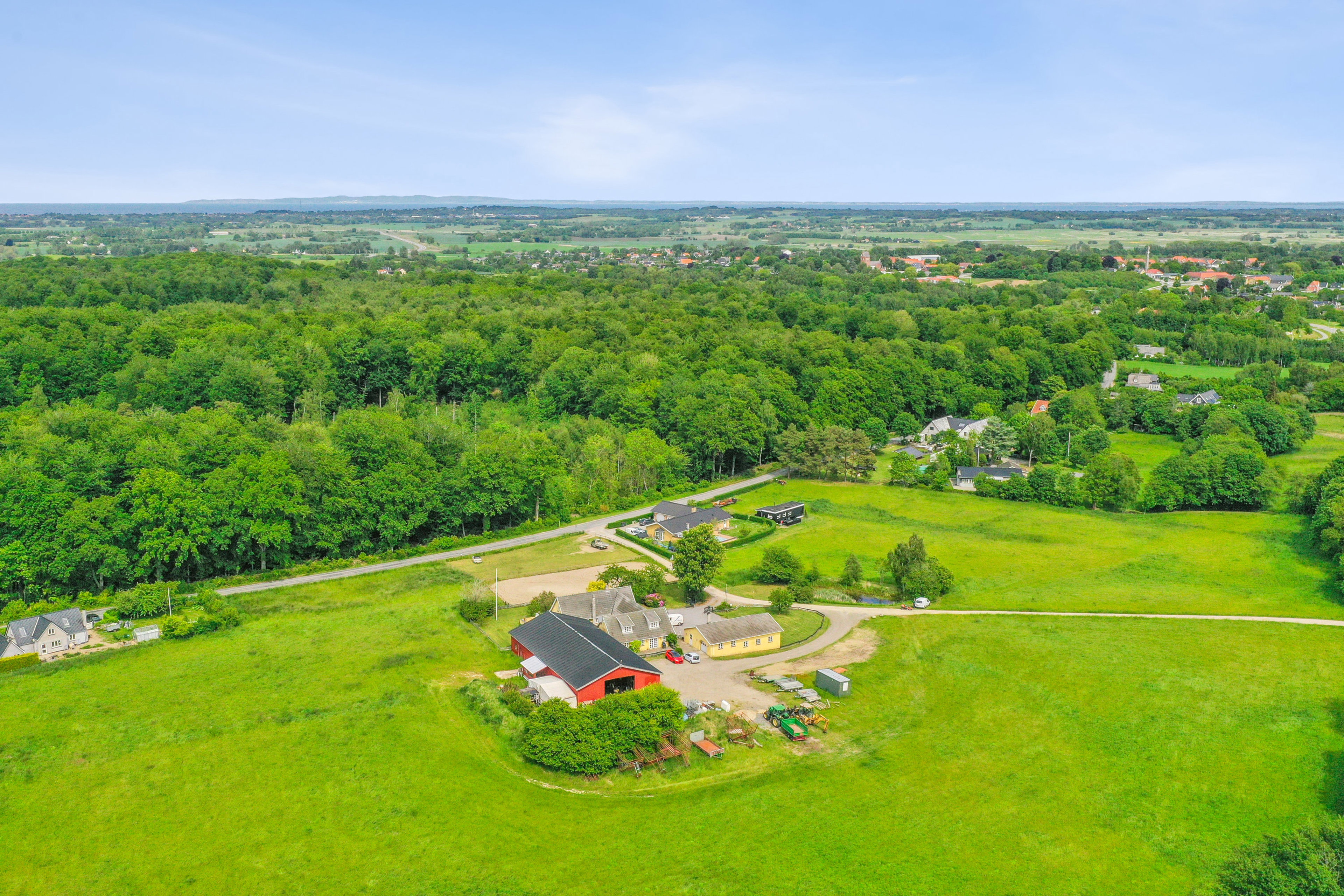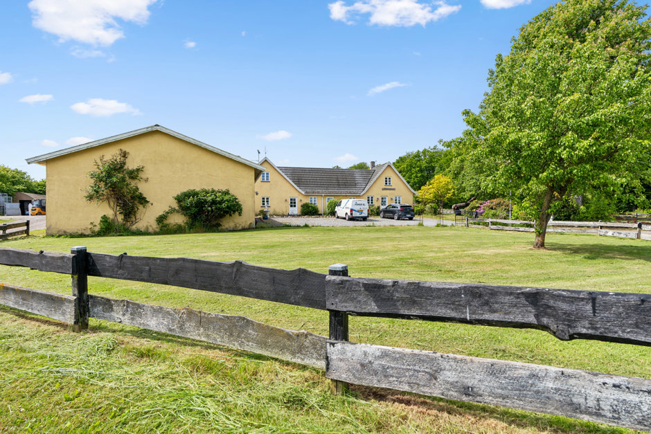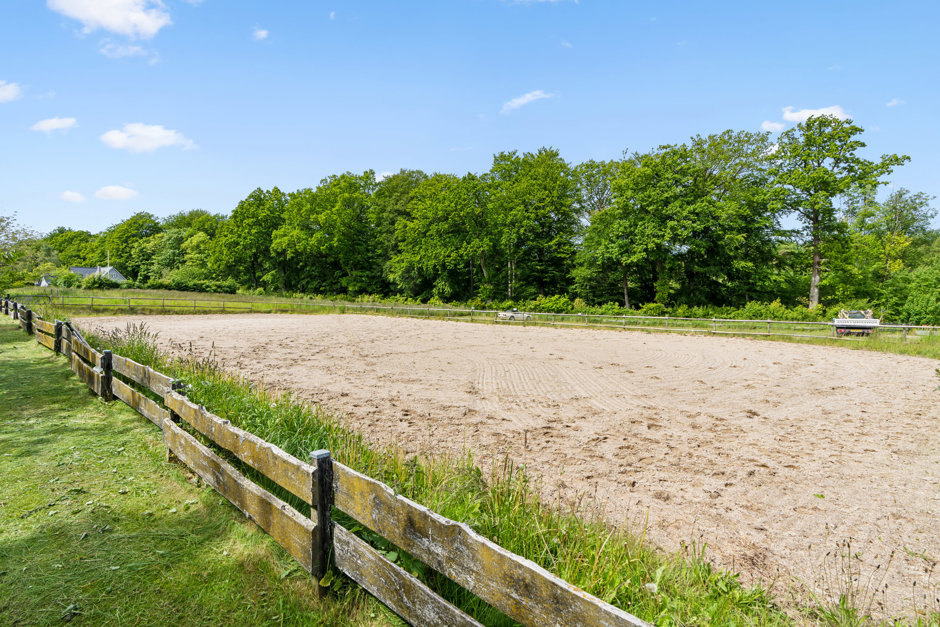 Foruden garagen finder I også den store stålhal, der under ét tag rummer både en højloftet maskinhal og en stald, der er indrettet med løsdrift samt fire bokse; det er desuden muligt at indrette yderligere fire. Ejendommen byder i det hele taget på gode hestefaciliteter, for her er også fold og ridebane – og så kan I naturligvis nyde de skønneste ridetur gennem skoven lige over vejen.