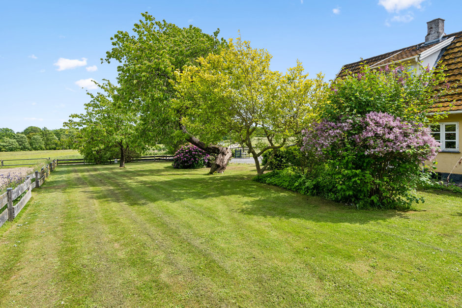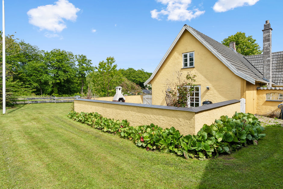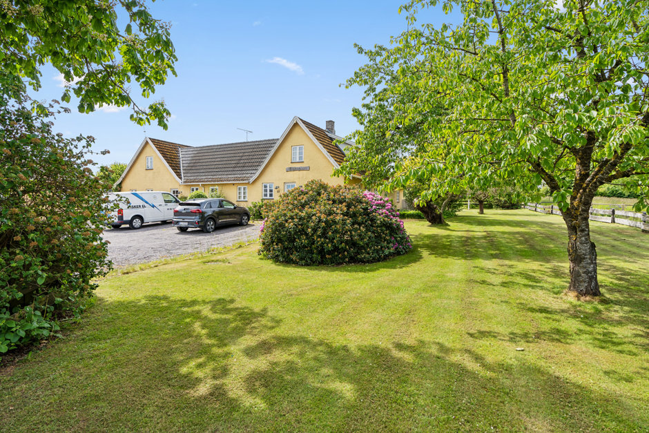 Når I endelig når til gårdspladsen, bydes I velkommen af Tidselholmgaard, som daterer sig helt tilbage til 1877 og på charmerende vis præsenterer sig med gul facade og hvide, småsprossede vinduer. Huset holdes med selskab af to gode udbygninger. I får bl.a. en dobbelt garage med tilstødende værksted og fyrrum, og det kan i den forbindelse nævnes, at ejendommen opvarmes ved kombineret pille- og brændeovn fra 2012. Der er desuden installeret ny Combi-varmtvandsbeholder i 2024.