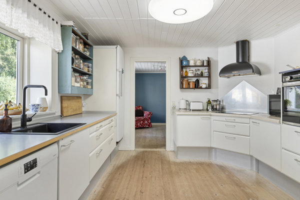 Det lyse køkken ligger centralt i boligen og er både rummeligt og veldisponeret med god bordplads og kig til gårdspladsen. Fra stueplan er der adgang til tre værelser, et lyst badeværelse med gulvvarme, praktisk bryggers og bagindgang. På førstesalen venter endnu et værelse samt et stort repos med udgang til overdækket altan – oplagt til gæsteafdeling, teenagezone eller hjemmekontor med udsigt til trætoppene.