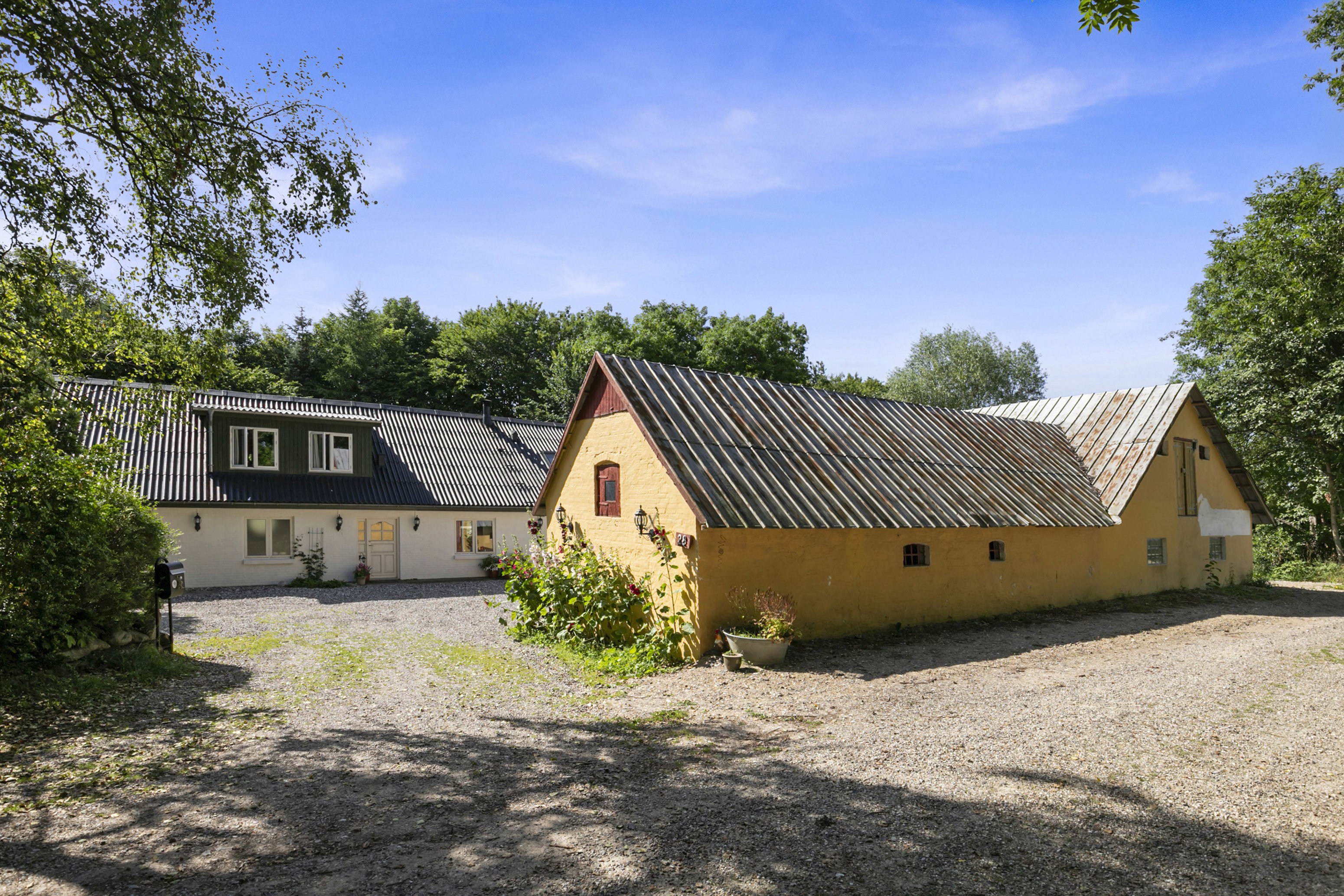 Udenfor kan du nyde flere hyggelige terrassemiljøer, vildmarksbad, gamle træer, frodige buske og en stor, ugeneret have. Her er fred og ro, plads til at udfolde sig – og mulighed for at realisere alt fra en selvforsynende livsstil til en hverdagsidyl midt i naturen.