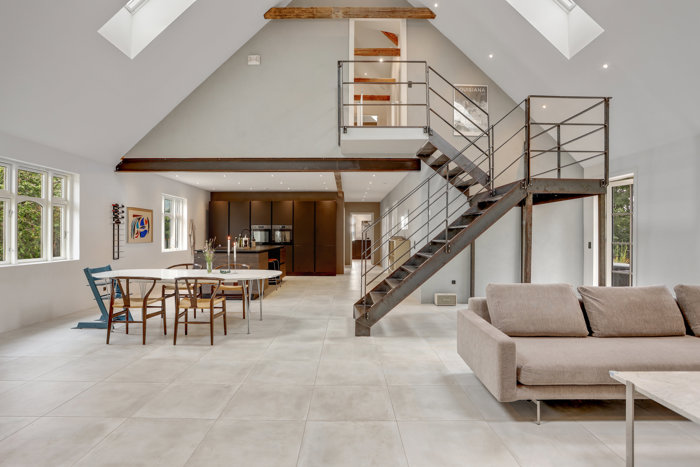 Fra den indbydende opholdsstue er der direkte adgang til haven, mens en hel endevæg beklædt med smukke akustikpaneler skaber varme, hygge og endnu et moderne touch. En unik og rustik metaltrappe fører op til førstesalen, hvor flere lyse værelser venter - herunder et stort værelse med fritlagte træbjælker og udsigt til haven, samt endnu et stort, stilfuldt badeværelse.