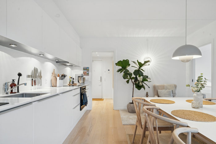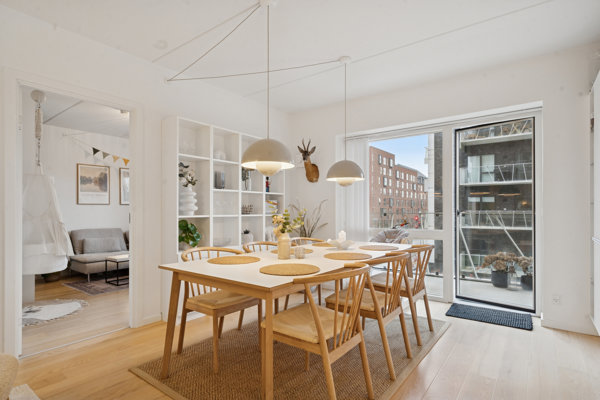 Alt i alt fremstår lejligheden gennemgående lys og harmonisk med hvidmalede vægge, kvalitetsgulve og en moderne indretning. En bolig, der er lige til at flytte ind i og oplagt til både singler, par og den lille familie, som ønsker en veldisponeret og stilfuld lejlighed i attraktive omgivelser.