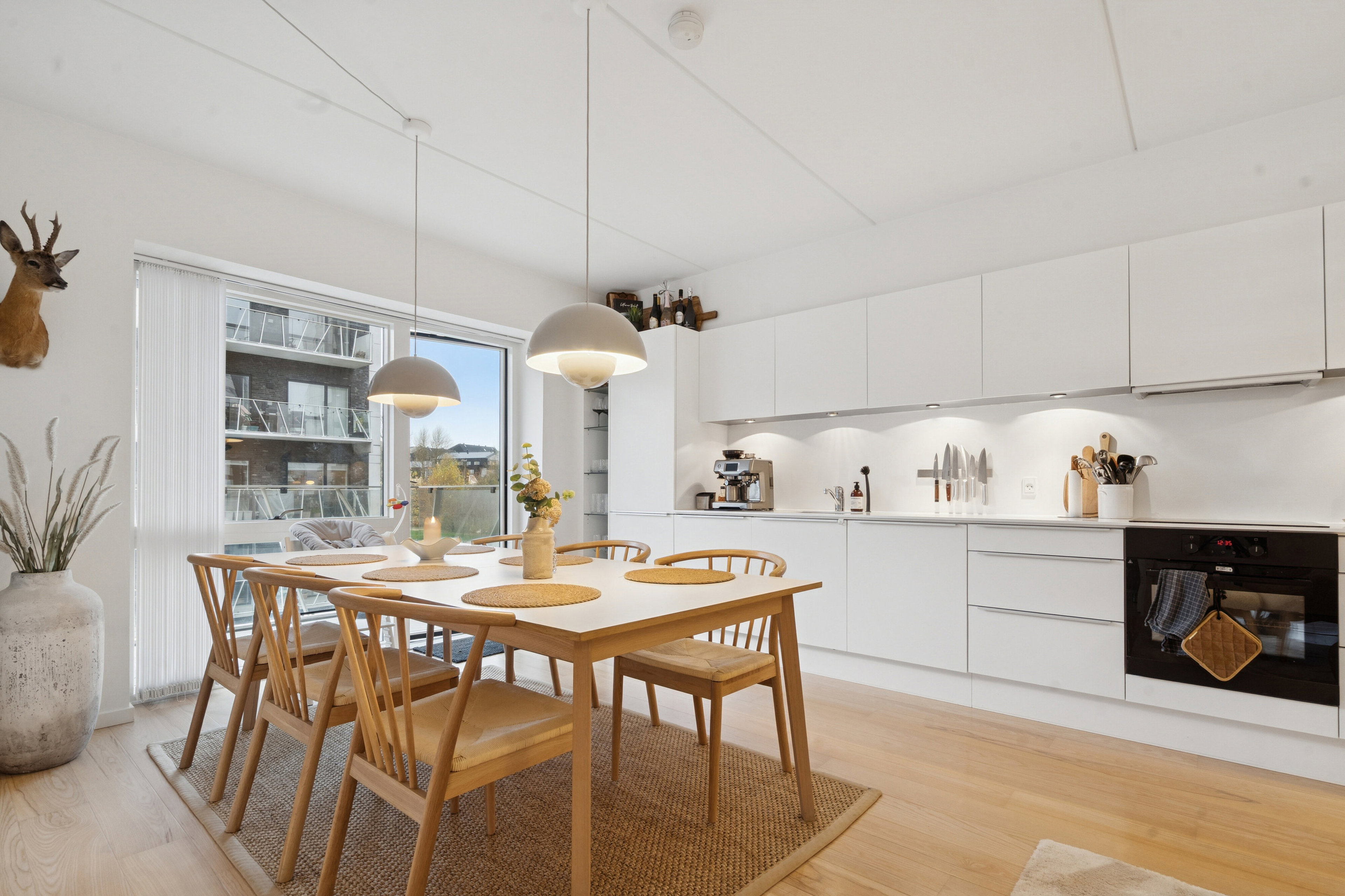 Her strømmer lyset ind gennem de store vinduespartier, der både skaber en behagelig atmosfære og giver direkte adgang til den rummelige altan.