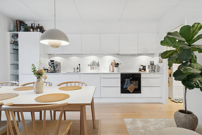 Boligens hjerte er det store, åbne køkken-alrum, hvor et stilrent, hvidt køkken strækker sig langs væggen og byder på god bord- og skabsplads samt integrerede hvidevarer. Køkkenet står skarpt og tidløst, og i åben forbindelse ligger spiseområdet med god plads til et spiseområde.