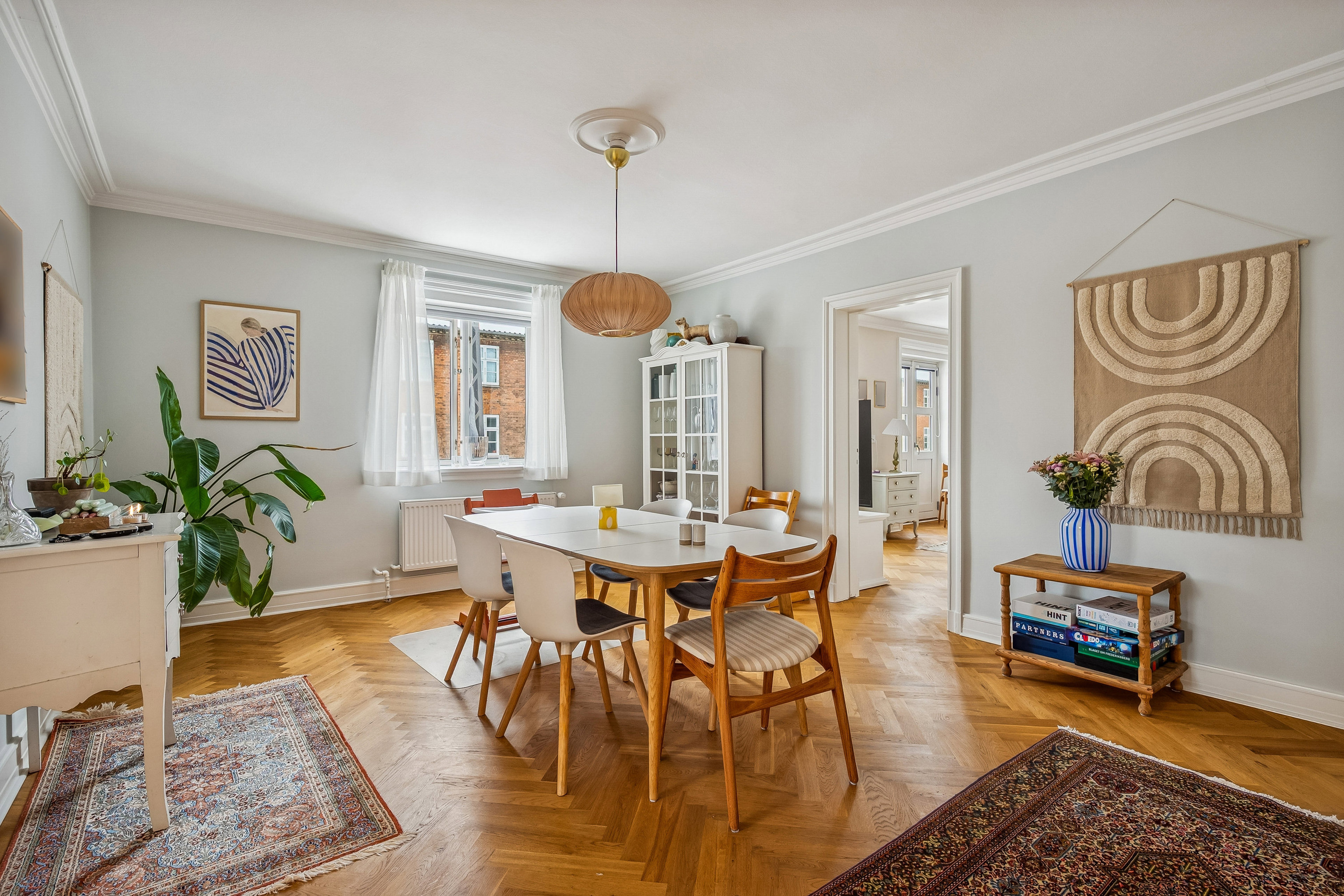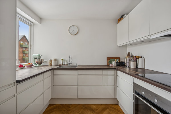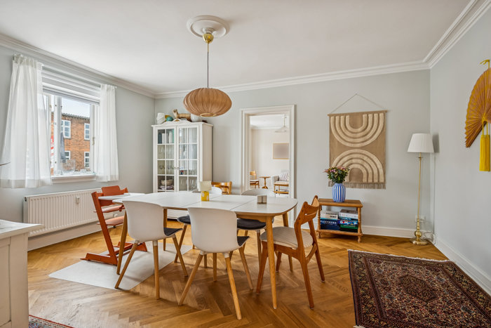 Hjemmets indretning er en fryd for øjet. Sildebensparketten løber fra rum til rum, og foroven pynter den fine stuk – og alle rum fremstår velholdte og lige til at rykke ind i. Derudover er der tale om en hjørnelejlighed, hvilket giver et dejligt lysindfald, og på sydsiden får I også en solrig altan ud til en rolig sidevej.