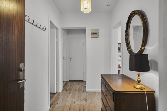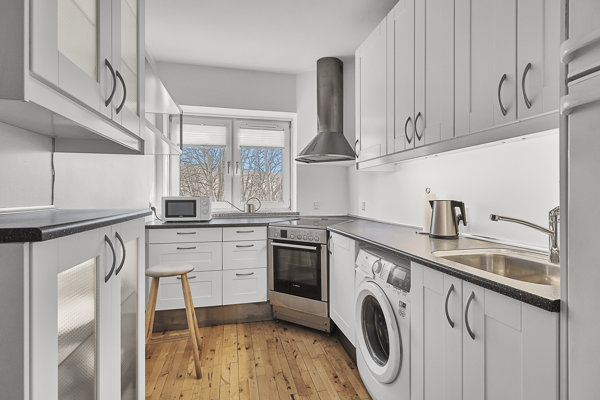 Lejligheden fremstår pæn og velpasset og byder på en god og funktionel planløsning med to regulære værelser, en lys stue samt et køkken, hvor udsigten gør noget særligt for stemningen. Fra køkkenvinduet kan du nemlig kigge ud over åen, som skaber en rolig og naturskøn kulisse året rundt. Det er en detalje, der giver hverdagen et ekstra strejf af kvalitet.