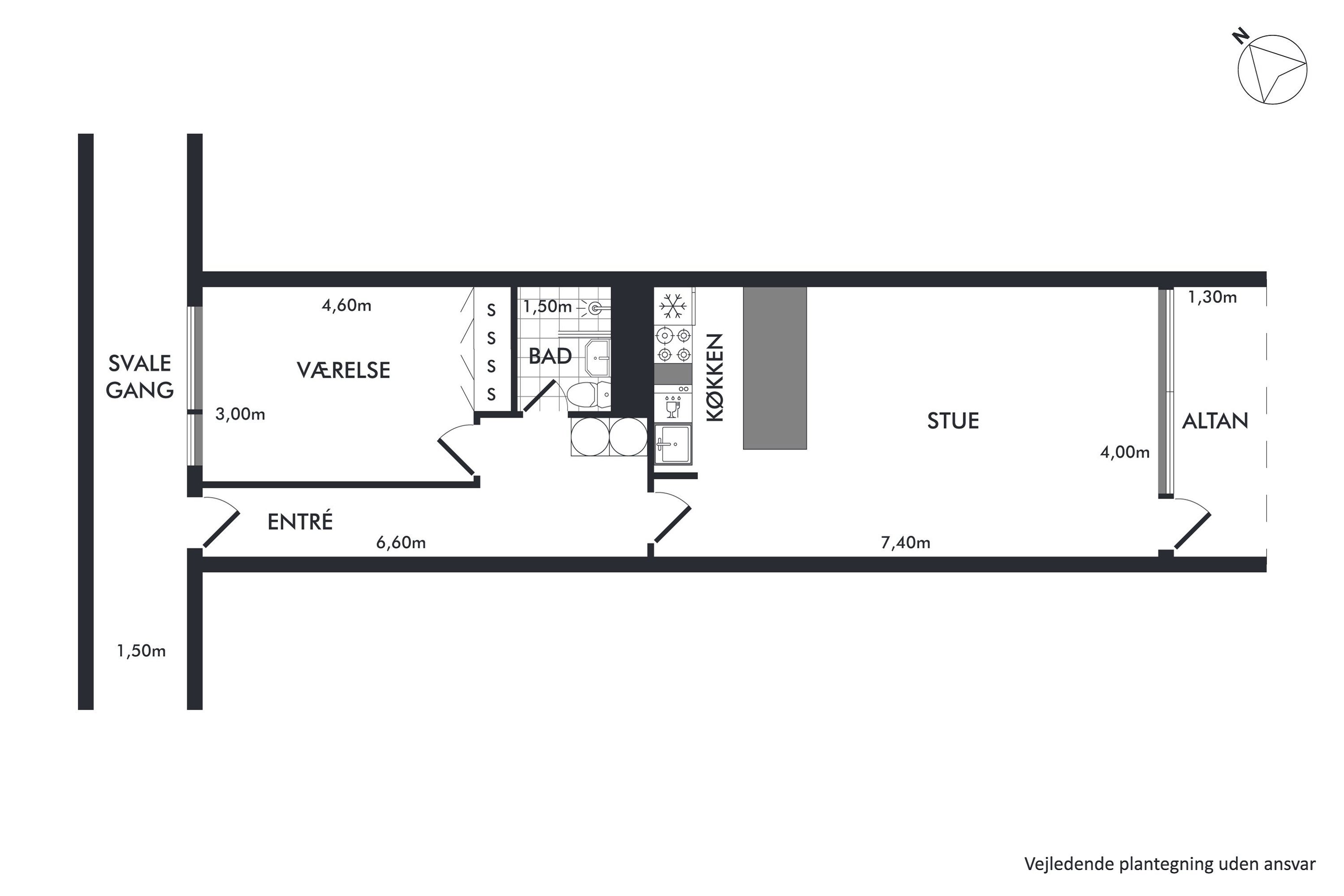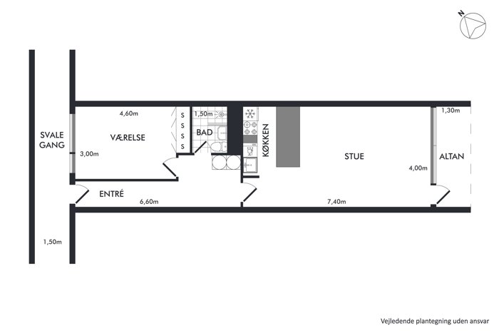 rum. Første dør til højre møder du et stort og rummeligt soveværelse, med god skabsplads. Træder du ud af soveværelset har du et funktionelt badeværelse med separat brus lige på højre hånd. Går du videre ind kommer du ind i et køkken-alrum, køkkenet er opdateret og moderne. I stuen er der masser af plads til at indrette både et spiseområde og en tv-stue. Fra stuen har du direkte adgang til den syd/vestvendte altan, som byder på masser af sol.