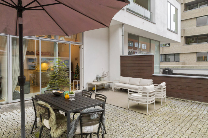 Et af boligens absolutte højdepunkter er den store terrasse, som fungerer som en naturlig forlængelse af boligen. Her er der rigelig plads til både loungemøbler, spisebord og grønne planter – perfekt til afslapning og udeliv i sommerhalvåret.