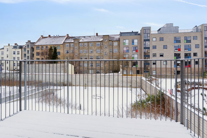 Den syd-sydvestvendte altan fungerer som en naturlig forlængelse af opholdsrummet. Her kan solen nydes det meste af dagen og helt frem til de sene aftentimer, mens udsynet til gårdrummet og de øvrige ejendomme skaber en sjælden ro midt i byen.