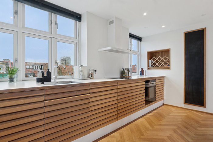 Gennemgående for lejligheden er den konsekvente materiale kvalitet, det naturlige lys og den rolige, moderne atmosfære. Det er en bolig, der føles både eksklusiv og hjemlig – et sted, hvor man straks mærker roen og kvaliteten i detaljerne.