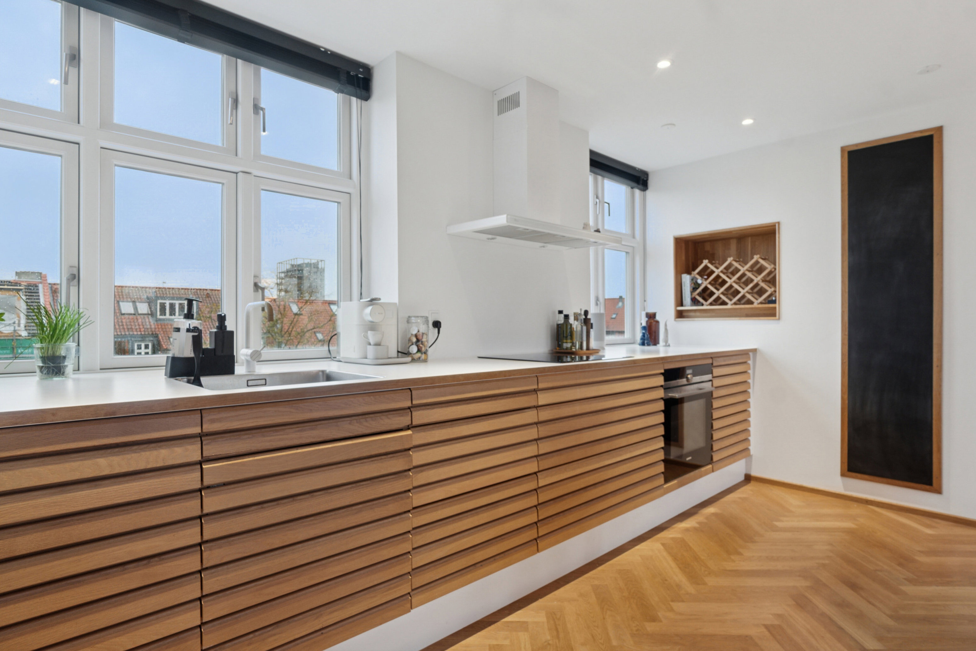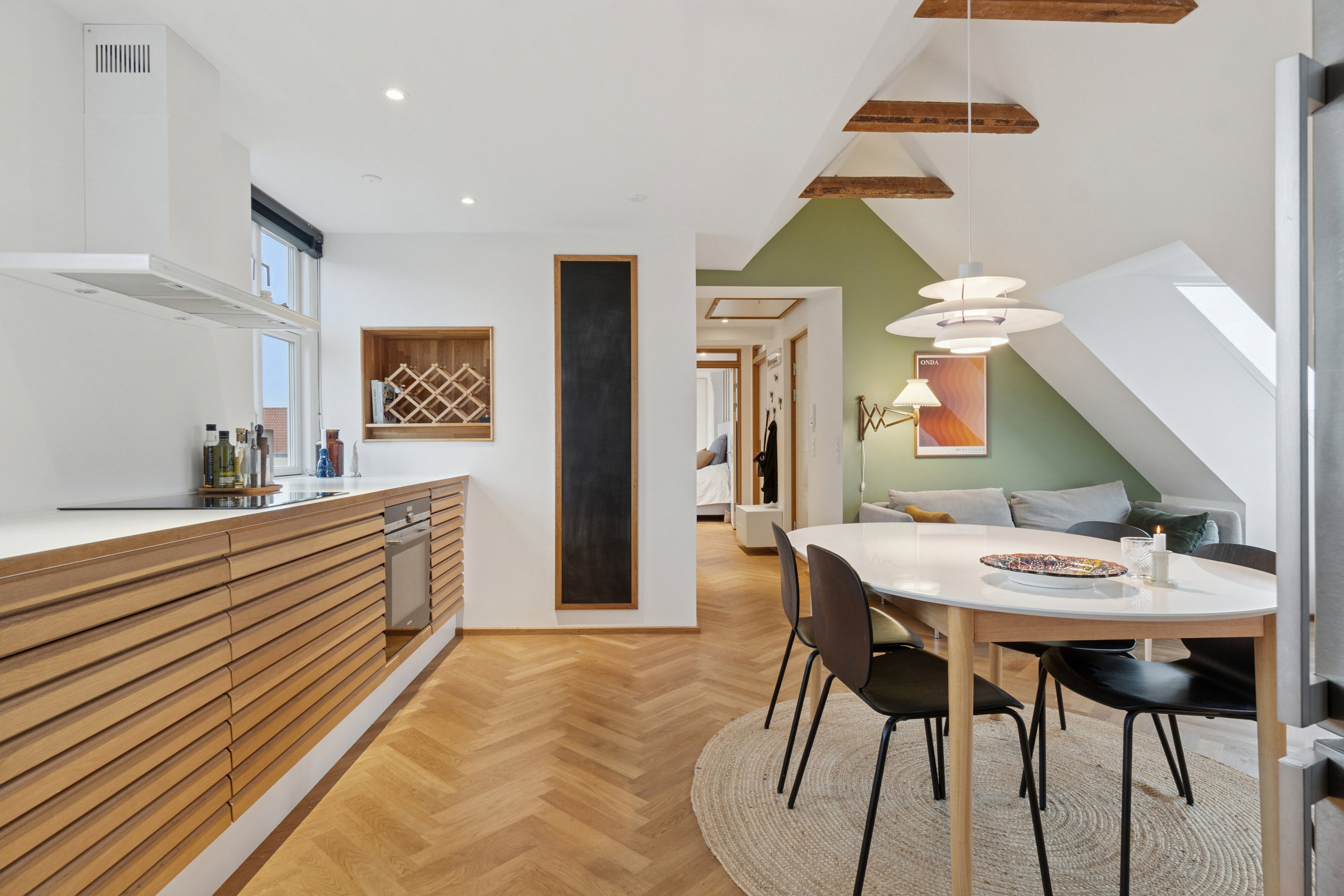 Boligens hjerte er det åbne alrum, hvor køkken, spiseplads og stue smelter sammen i én stilren helhed. Det eksklusive køkken fremstår i et tidløst design med fronter i elegant trælamel, hvide overflader og integrerede hårde hvidevarer. De gennemgående materialer, de flotte sildebensgulve og de fritlagte bjælker giver rummet et både eksklusivt og indbydende udtryk. Her er skabt den perfekte balance mellem funktionalitet og æstetik – ideelt til både afslappede hverdage og hyggelige aftener med gæster.