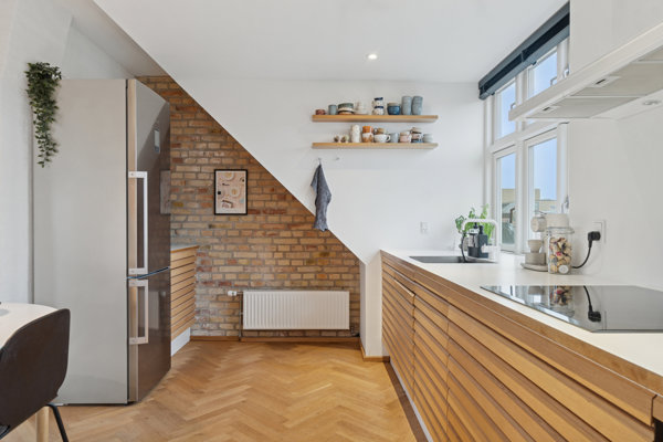 Træd indenfor i denne elegante og gennemførte taglejlighed, hvor moderne nordisk minimalisme møder varme materialer og klassisk charme. Her er intet overladt til tilfældighederne – alt er udført i kvalitetsmaterialer, og lyset strømmer ind gennem de smukke kvistvinduer, som giver boligen en luftig og harmonisk stemning.