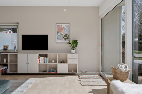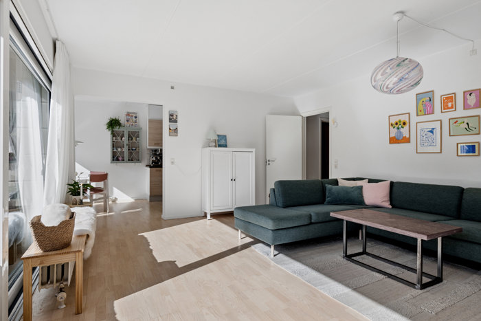 Ved indtræden byder boligen velkommen med en bred og praktisk entré med god plads til sko og overtøj. De to værelser ligger side om side, og overfor finder du det rummelige badeværelse med separat bruseniche, vaskearrangement samt vaskemaskine og tørretumbler. Boligens naturlige samlingspunkt er den store, lyse stue, som danner et skønt opholdsrum med et dejligt sydvendt lysindfald.