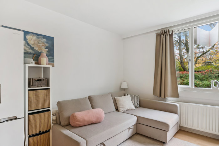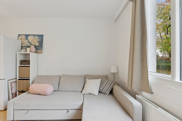 Lejligheden indeholder: Allerede fra du træder indenfor i entréen, fornemmer du hvor lyst og rummeligt et hjem, der venter dig. Entréen har en rigtig fin størrelse, og de indbyggede skabe langs hele endevæggen sørger for godt med opbevaringsløsninger. Alternativ til denne indretning kan man opføre og skabe et lille værelse, hvis du ønsker et separat rum. Ret fremme har du opholdsmiljøet, hvor det lyse, velindrettede køkken er udført i en praktisk vinkel, og hele rummet er ganske indretningsvenligt, så du nemt får plads til spisebord, sovesofa og andet. Solen strømmer dejligt ind fra syd gennem det store vindue, og herfra er udsigten til de grønne fællesarealer rigtig god. Det sidste, du skal se, er det pæne badeværelse med separat bruseafsnit og væghængt toilet.