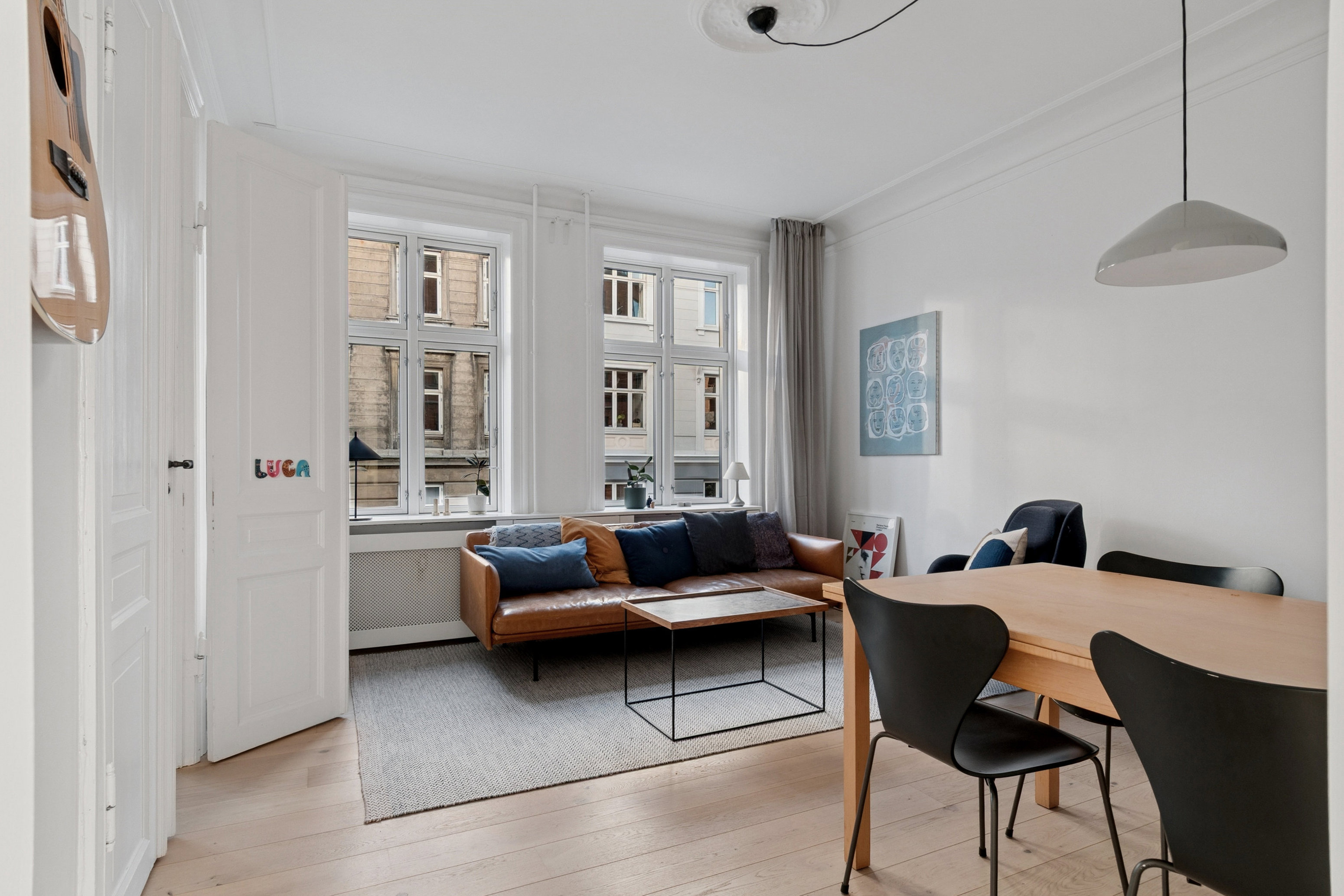 Lejligheden gør et godt indtryk fra første øjekast. Højt til loftet, dannebrogsvinduer fra 2023 og stuk giver herskabelige toner, og samtidig får I et lyst, moderne og meget indbydende hjem. Ensartede gulve i egetræ løber fra rum til rum, el er fræset ind i væggene og der er filt på væggene.