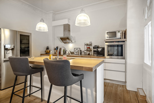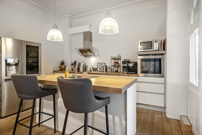 Køkkenet i hvide elementer og med ovnen i en god arbejdshøjde inviterer til samvær med køkkenø og plads til et par barstole.