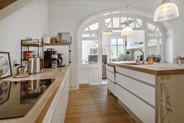 De centrale opholdsrum i form af køkken alrum og stue fremstår med højt til loftet og flotte stuk. Fin detalje med vitrinedør og glasparti imellem rummene, så lyset strømmer igennem.