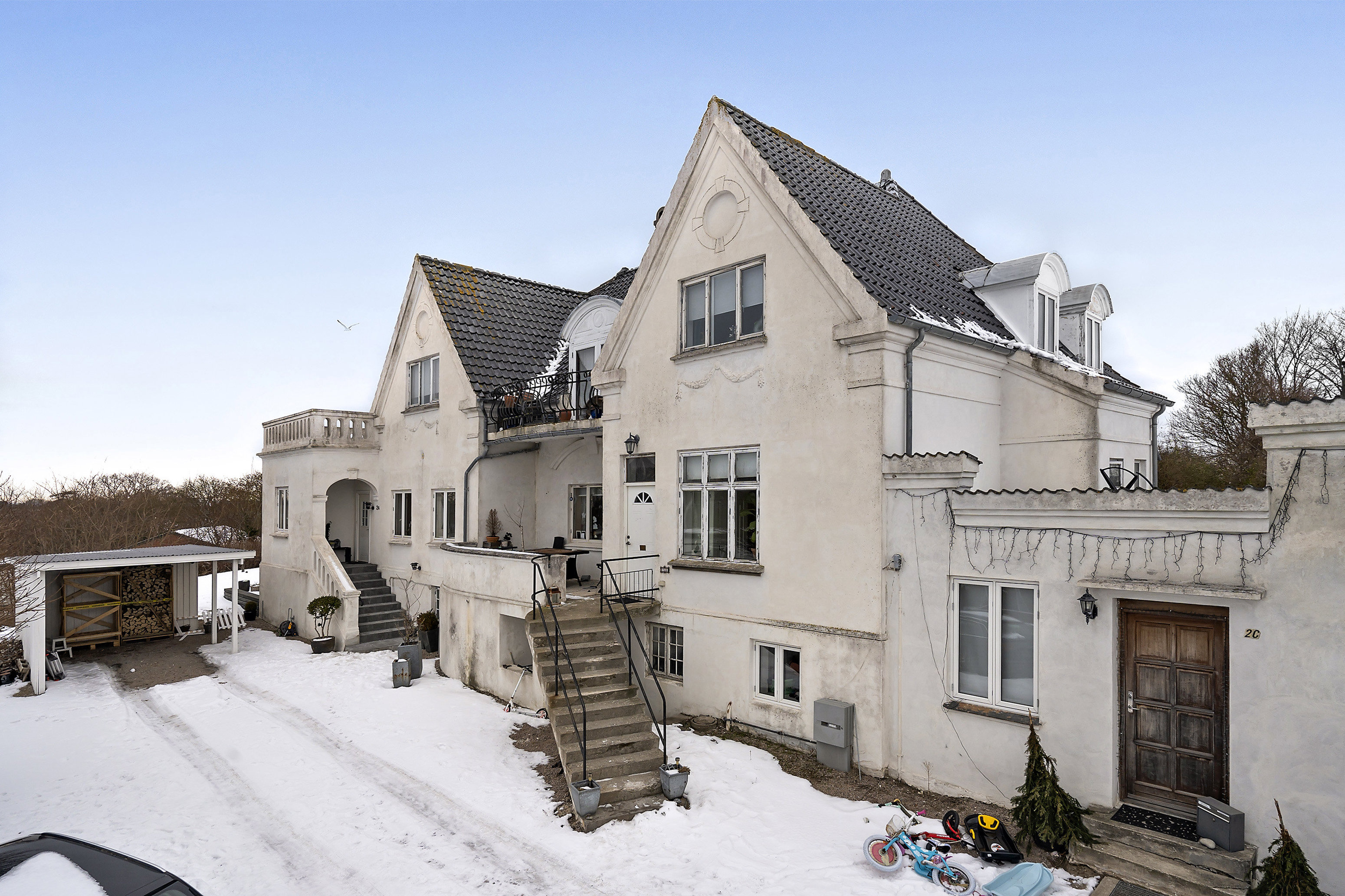 Næsten som nabo til Byparken ligger denne store ejendom, der er opdelt i 4 separate ejerlejligheder. Godt naboskab og en stor grund, der er opdelt med 4 private haver, så hver enkelt kan nyde udelivet med egen familie.