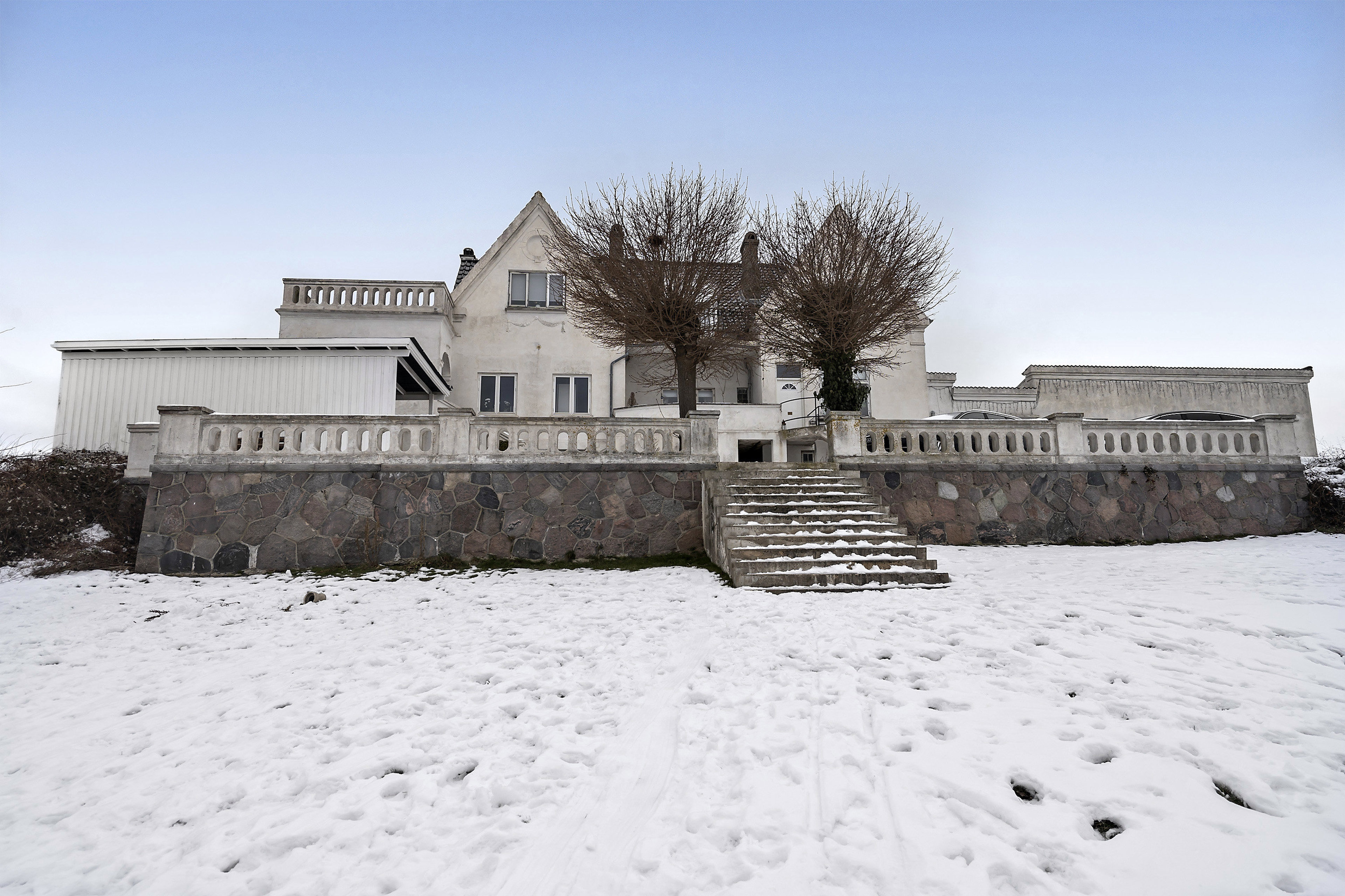 En støbt trappe fører op til indgangsdøren til Christiansgave 2B, hvor der lige udenfor er plads til et cafébord med udsigt til den store have, og hvor såvel solopgangen som den sene aftensol kan nydes.