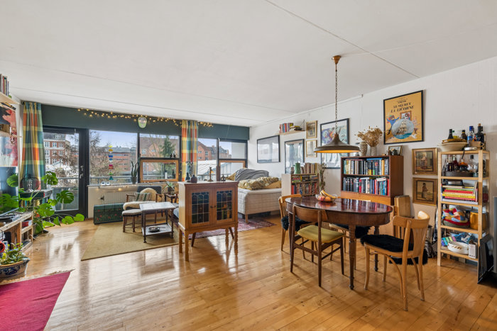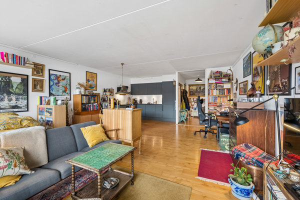 Tag elevatoren til 2. sal, hvor du mødes af en yderst veludnyttet planløsning. Entréen har god plads til overtøj, og til højre finder du et rummeligt badeværelse med badekar og vaskemaskine. Det store køkken-alrum byder på et Svane-køkken fra 2020 med opvaskemaskine, generøs bordplads og masser af skabsplads. Det oprindelige soveværelse er i dag integreret i opholdsarealet, men kan let reetableres, hvis du ønsker et separat rum med plads til seng og garderobe. Fra stuen er der udgang til en hyggelig, overdækket altan med fri udsigt – perfekt til morgenkaffen eller et glas vin efter en lang dag.