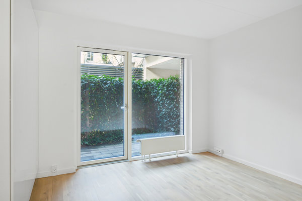 I den modsatte ende finder I soveværelset, der har indbyggede skabe og udgang til den anden terrasse, som vender skønt mod vest. Endelig skal I se badeværelset, som har en enormt god størrelse og et elegant udtryk. Her er der muret bruseniche, godt med opbevaringsplads samt en vaskesøjle.