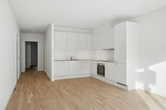 I får hjemme i stueetagen i en nydelig ejendom fra 2018, som præsenterer sig flot i området. I træder indenfor via entréen, der ligger i åben forbindelse med opholdsmiljøet. Her får I et stilrent køkken med hvide, grebsfrie fronter samt både under- og underskabe, som giver rigtig godt med opbevaringsplads. Stuen ligger i åben forbindelse med køkkenet, og gennem de østvendte vinduer og terrassedøren stråler et dejligt dagslys ind.