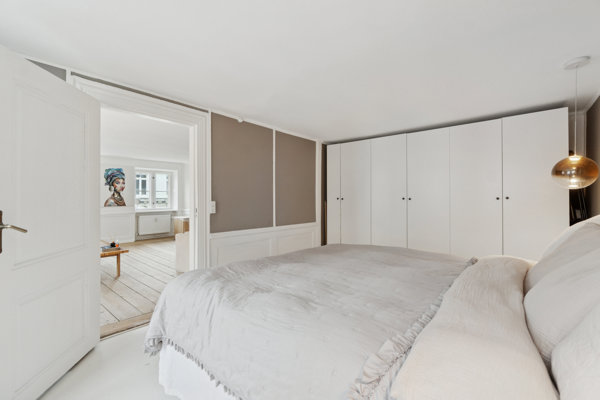 Allerede ved første skridt indenfor fornemmer man boligens sjæl. Det naturlige lys strømmer ind ad de store vinduespartier fra flere verdenshjørner og fremhæver de smukke gulve, de klassiske detaljer og den harmoniske planløsning. Hjemmet består af tre veldisponerede værelser, hvor stue og spisestue smelter elegant sammen – perfekt til både hverdags ro og middage med gode venner.