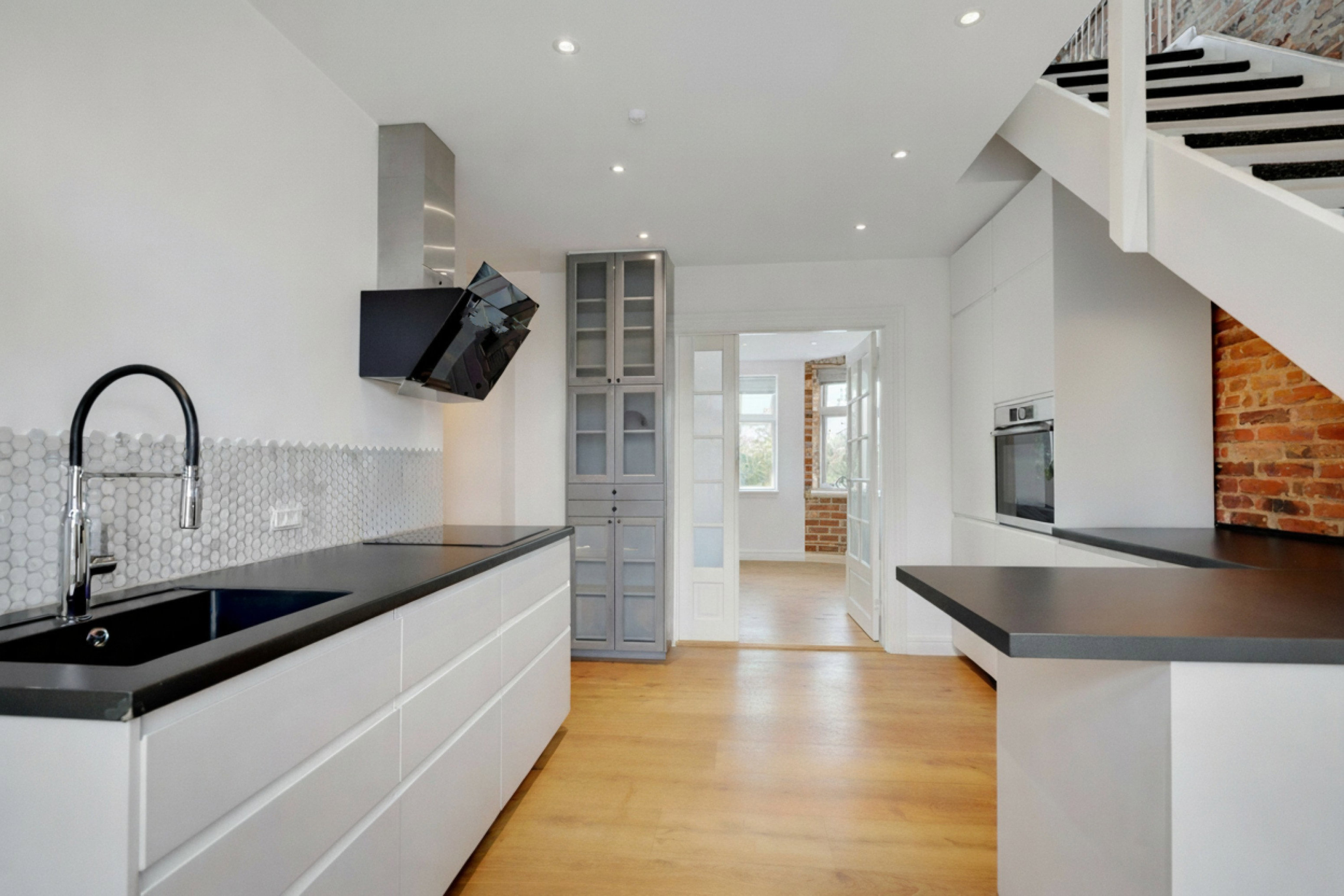 Køkkenet ligger på nederste plan og er stilrent og funktionelt med god bord- og skabsplads samt mulighed for siddepladser. De rå New Yorker-vægge og de velbevarede detaljer skaber en fed kontrast til de moderne løsninger og binder boligen flot sammen.