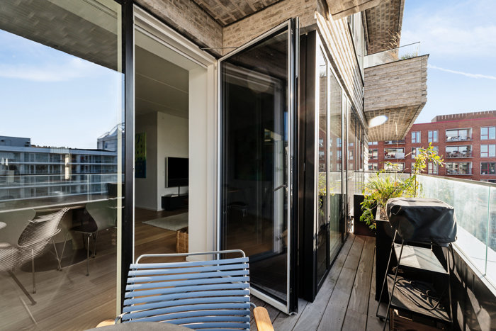 Oppe på tredje sal venter så dit nye hjem. Den høje placering sikrer dig et uspoleret lysindfald, og mod vest har du den skønneste udsigt over kvarterets kanaler. En udsigt, som du kan nyde fra din egen altan, der er garanteret både eftermiddags- og aftensol.